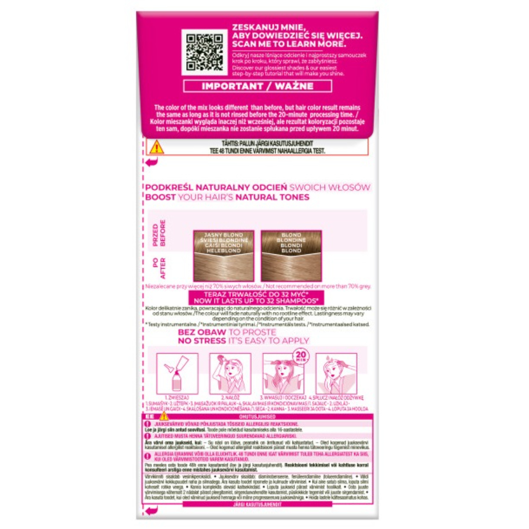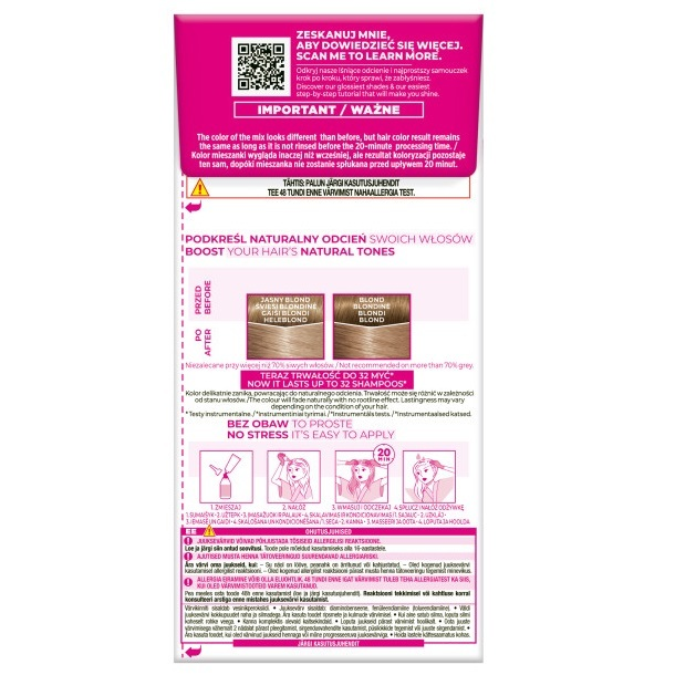 Przestrzegaj instrukcji użycia zawartych w opakowaniu. Zrób test 48 godzin przed planowaną koloryzacją dla zapewnienia bezpieczeństwa. Szczegółowe informacje dotyczące aplikacji znajdują się wewnątrz opakowania.