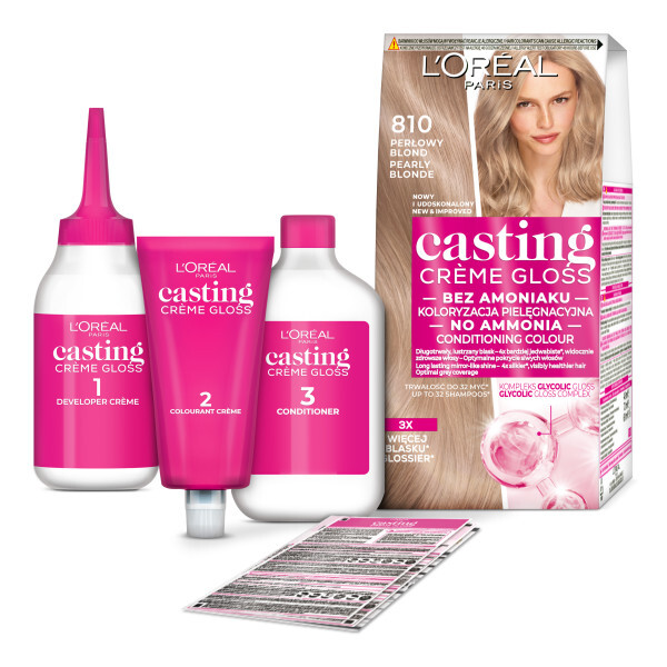 Odkryj farbę do włosów L'Oreal Paris Casting Creme Gloss 810 Perłowy Blond, która oferuje szybkie i łatwe w użyciu rozwiązanie do koloryzacji bez amoniaku. Ta wyjątkowa formuła zapewnia lśniące włosy oraz optymalne pokrycie siwych włosów. Ciesz się aż 3 razy większym blaskiem, widocznie zdrowszymi włosami i doskonałym pokryciem siwizny.
