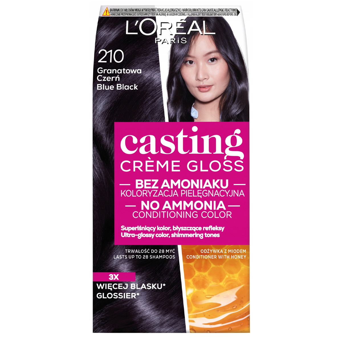 L'Oreal Paris Casting Crème Gloss Farba do włosów 210 Granatowa czerń to innowacyjny sposób na trwałą koloryzację bez amoniaku. Kremowa formuła zapewnia pełne pokrycie siwych włosów oraz intensywny, głęboki odcień granatowej czerni, nadając włosom zdrowy blask i jedwabistą miękkość. To idealny wybór dla osób poszukujących bezpiecznego i skutecznego rozwiązania do domowej koloryzacji.