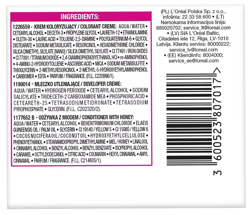 1226559 - Aqua / Water • Cetearyl Alcohol • Deceth-3 • Propylene Glycol • Laureth-12 • Ethanolamine • Oleth-30 • Lauric Acid • Toluene-2,5-diamine • Polyquaternium-6 • Glycol Distearate • Sodium Metasilicate • Resorcinol • Hexadimethrine Chloride • Silica Dimethyl Silylate [nano] / Silica Dimethyl Silylate • Ci 77491 / Iron Oxides • Ci 77891 / Titanium Dioxide • 2,4-diaminophenoxyethanol Hcl • M-aminophenol • 4-amino-2-hydroxytoluene • Ascorbic Acid • Mica • Sodium Metabisulfite • Thioglycerin • 2-methylresorcinol • 2-methyl-5-hydroxyethylaminophenol • Carbomer • Edta • Parfum / Fragrance (f.i.l. C220996/1).