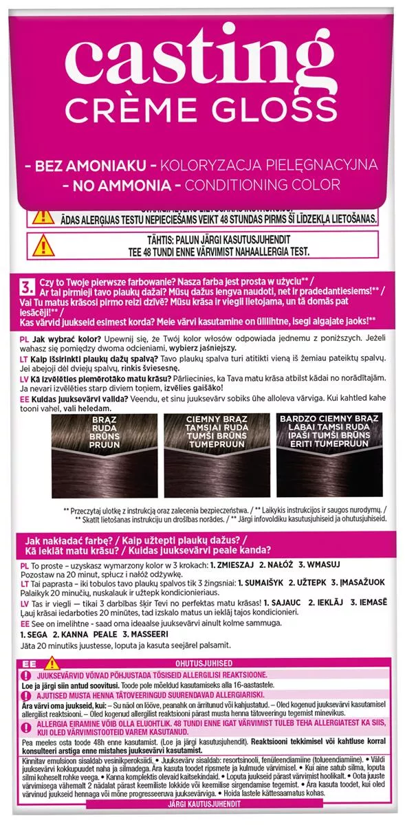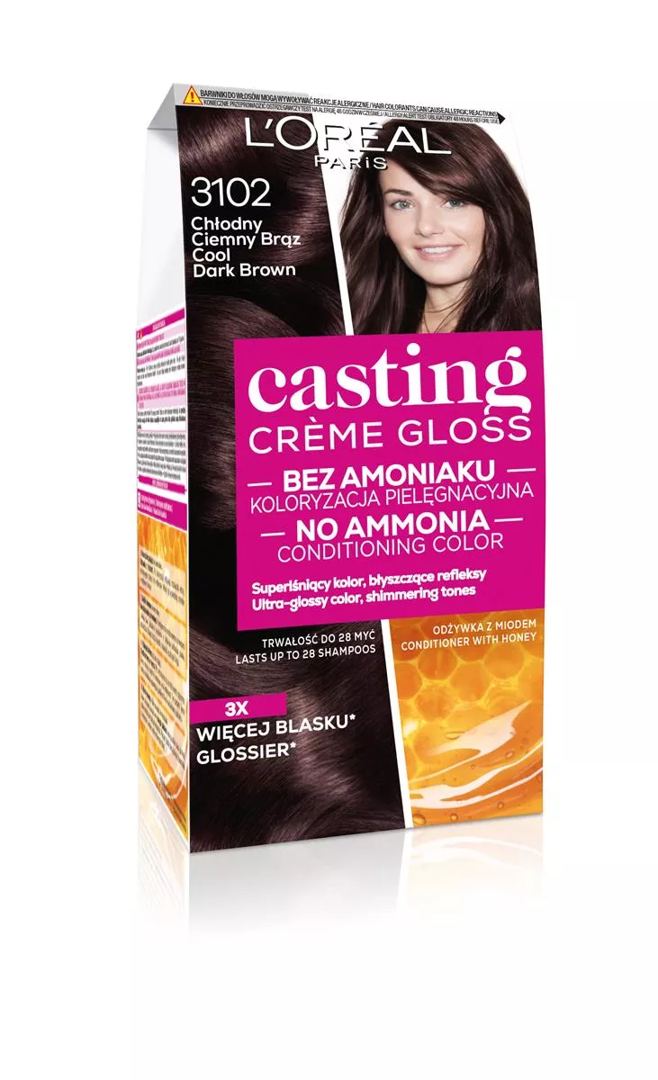 L'Oreal Paris Casting Crème Gloss Farba do włosów 3102 Chłodny ciemny brąz to część nowej kolekcji "Cool Brunette", która oferuje idealne połączenie popielatych i opalizujących refleksów. Te innowacyjne odcienie skutecznie neutralizują niepożądane ciepłe tony, zapewniając naturalnie wyglądający kolor o wyjątkowym blasku. Jest to numer 1 wśród farb bez amoniaku w Polsce*, co potwierdzają wartościowe udziały rynkowe w kategorii koloryzacji włosów, segment farb bez amoniaku, za okres od stycznia do czerwca 2020 roku, w całej Polsce.