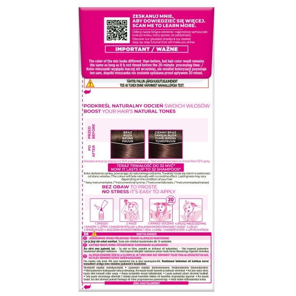 Przestrzegaj instrukcji użycia zamieszczonej wewnątrz opakowania. Przed koloryzacją wykonaj test 48-godzinny, aby zapewnić bezpieczne rezultaty.