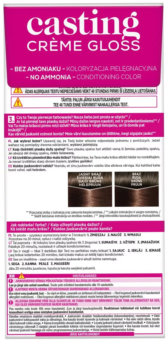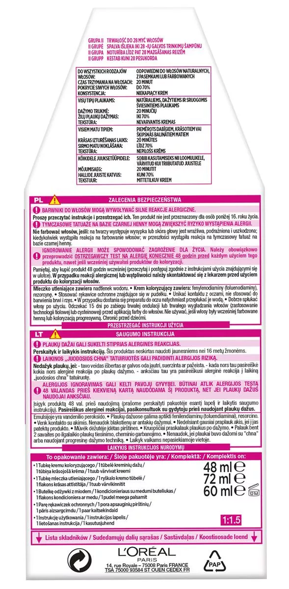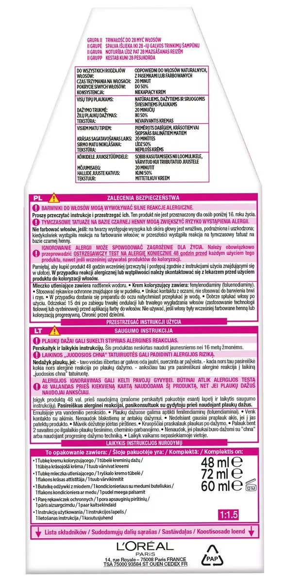 Przestrzegaj instrukcji użycia znajdujących się wewnątrz opakowania. Zaleca się wykonanie testu na 48 godzin przed koloryzacją dla bezpieczeństwa.