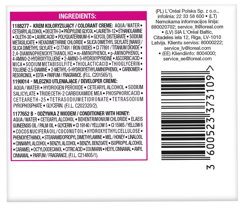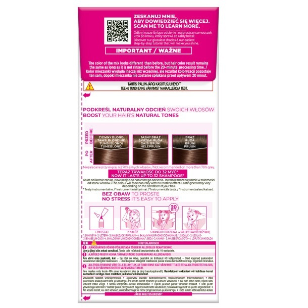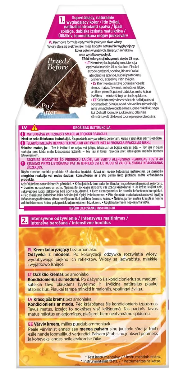 Przestrzegaj instrukcji użycia zawartych wewnątrz opakowania. Dla bezpiecznej koloryzacji wykonaj test 48 godzin wcześniej.