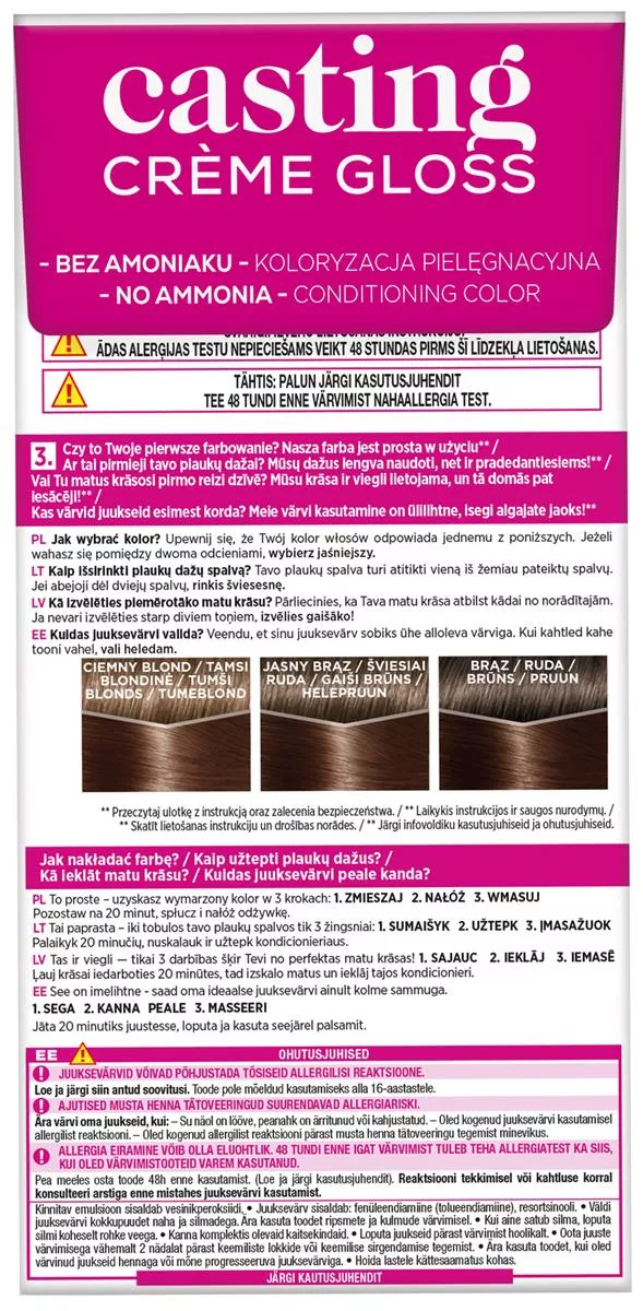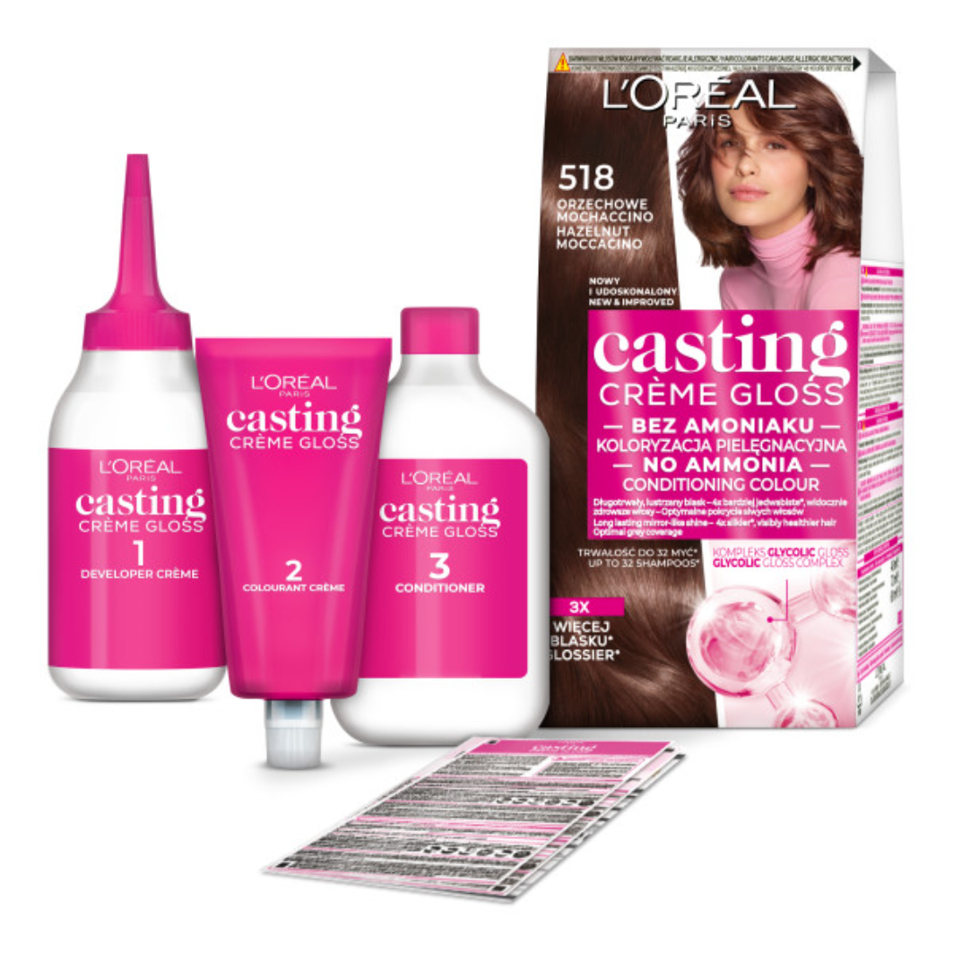 Kremowa formuła farby do włosów L'Oreal Paris Casting Crème Gloss 518 Orzechowe mochaccino optymalnie pokrywa siwe włosy, nadając im piękny, naturalnie wyglądający kolor pełen wyraźnych, lśniących refleksów oraz wyjątkowy połysk. Efekt koloryzacji utrzymuje się aż do 28 myć. Produkt ten jest numerem 1 wśród farb bez amoniaku w Polsce*, co jest potwierdzone badaniami L’Oréal za Nielsen, wartościowe udziały rynkowe w kategorii koloryzacji włosów w segmencie farb bez amoniaku z okresu 1-6.2020.