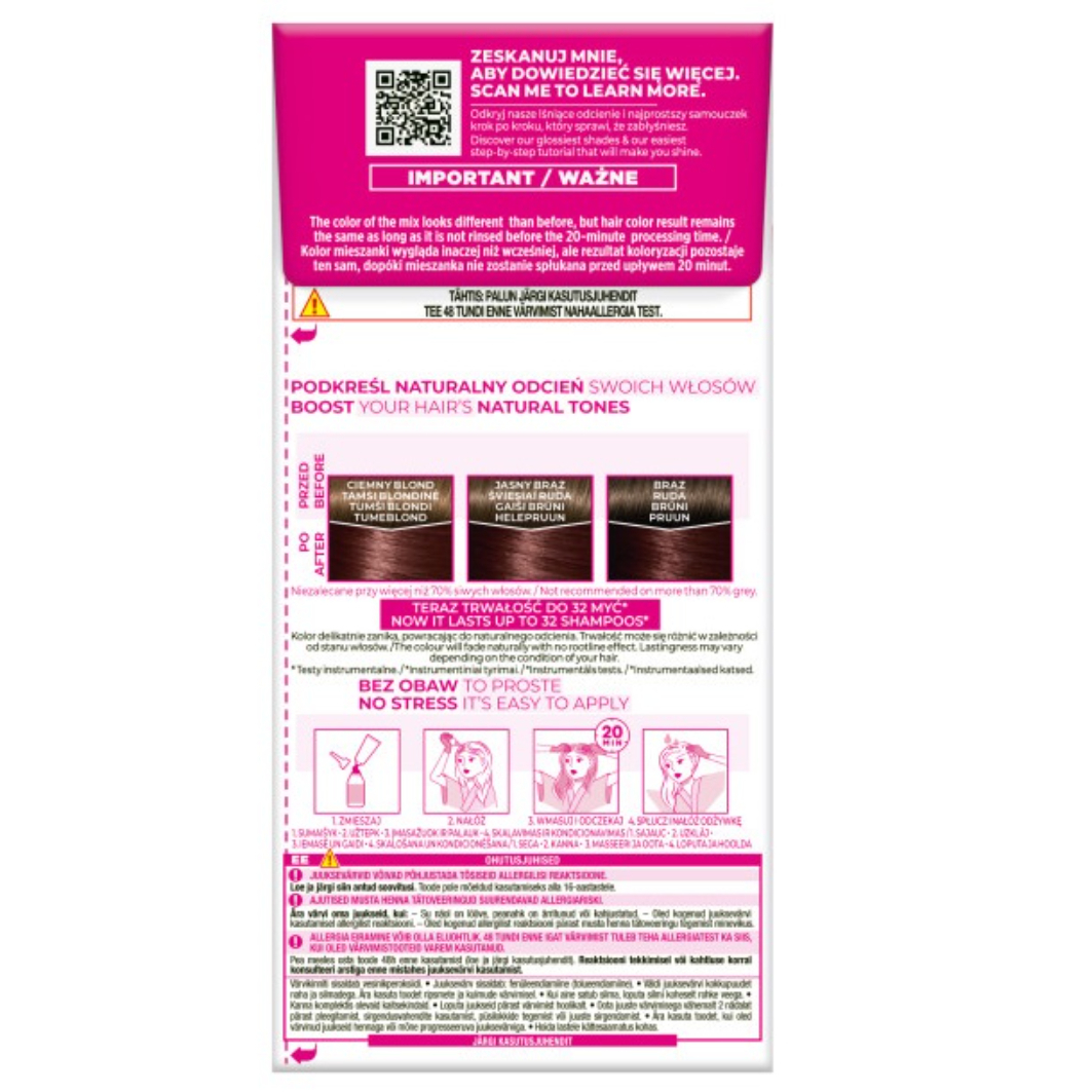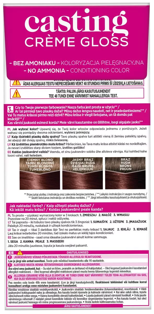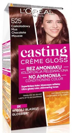 L'Oreal Paris Casting Crème Gloss Farba do włosów 525 Czekoladowy mus to idealne rozwiązanie dla osób poszukujących naturalnie wyglądającego koloru bez użycia amoniaku. Ta kremowa formuła doskonale pokrywa siwe włosy, nadając im bogaty kolor pełen wyraźnych, lśniących refleksów oraz wyjątkowy połysk. Efekt koloryzacji utrzymuje się do 28 myć, co czyni ją praktycznym wyborem dla każdej osoby ceniącej sobie trwałość i piękno.
