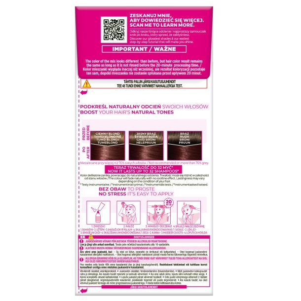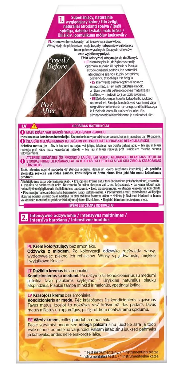 Przestrzegaj instrukcji użycia zawartej wewnątrz opakowania. Aby zapewnić bezpieczną koloryzację, wykonaj test 48 godzin przed użyciem.