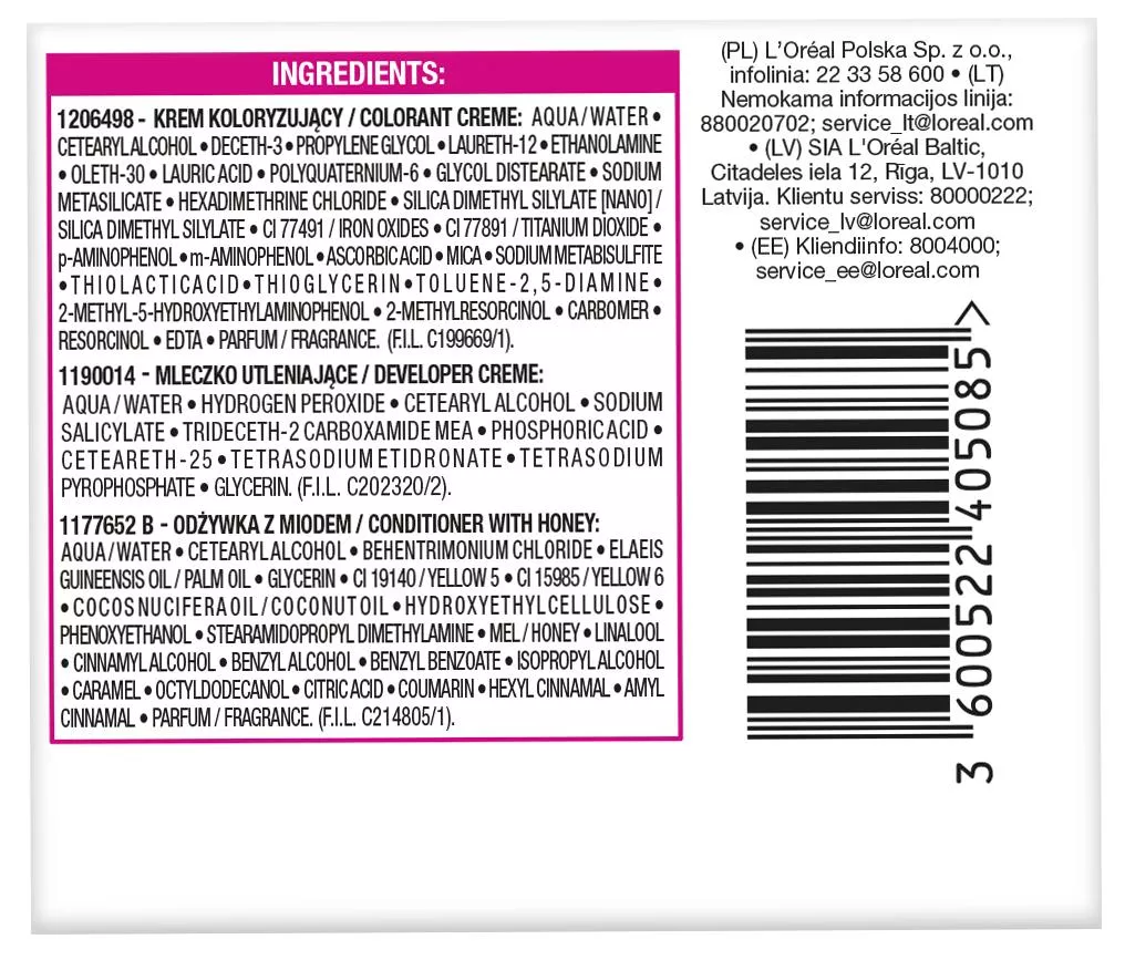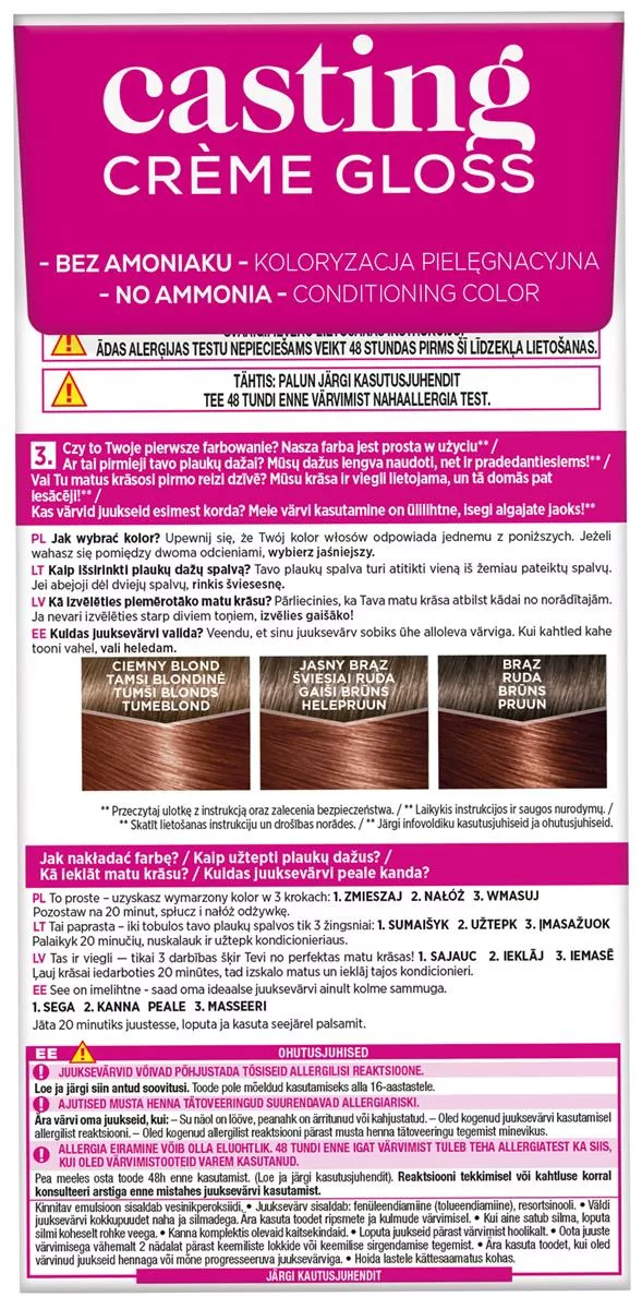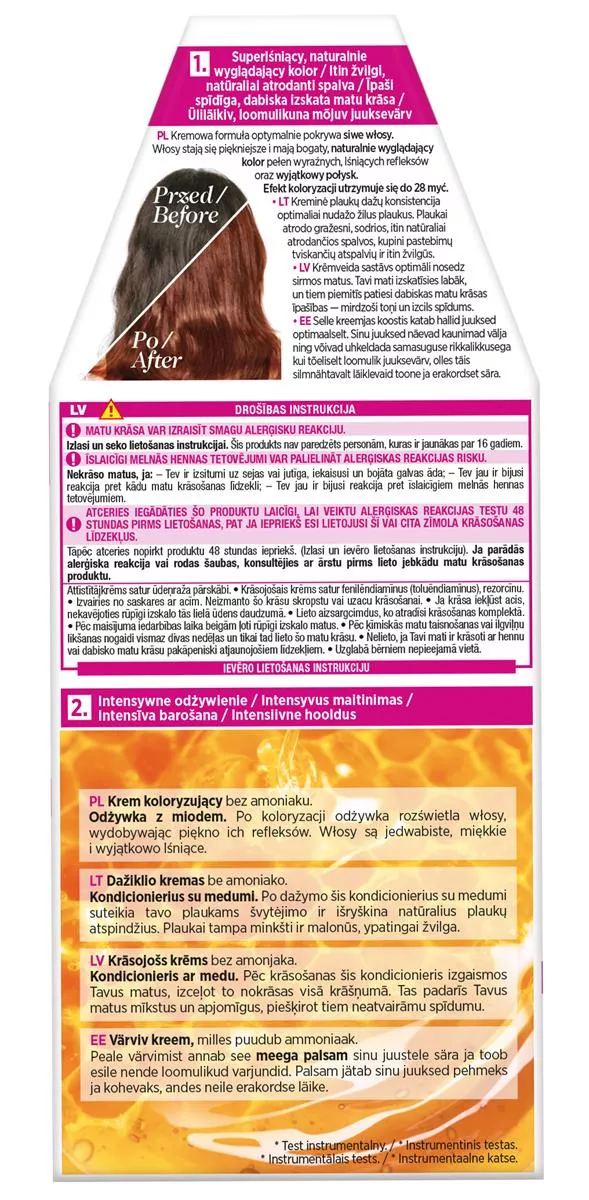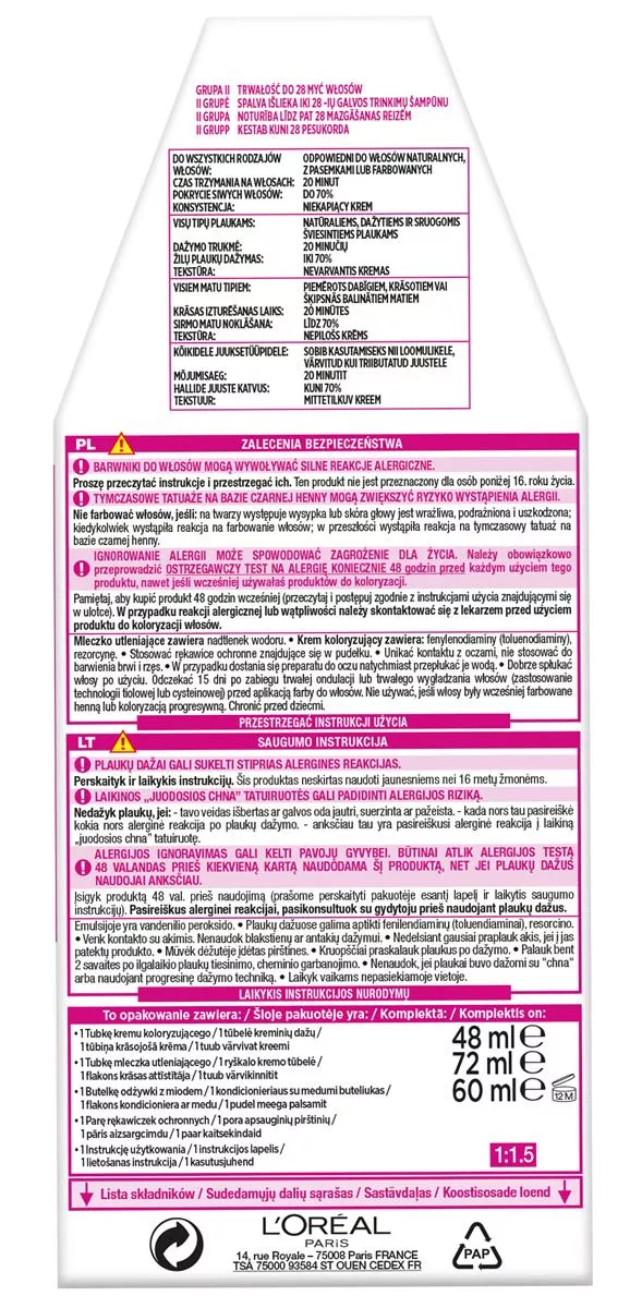 Przestrzegaj instrukcji użycia umieszczonych wewnątrz opakowania. Dla bezpiecznej koloryzacji, wykonaj test 48 godzin wcześniej.