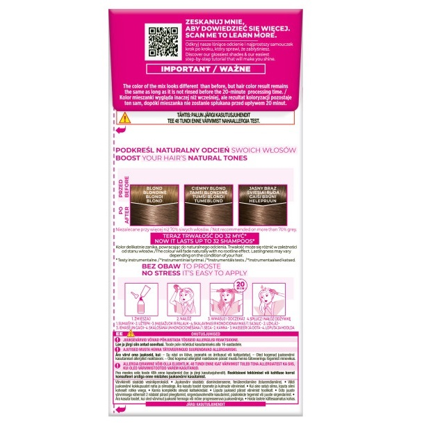 Przestrzegaj instrukcji użycia zawartych w opakowaniu. Dla bezpiecznej koloryzacji wykonaj test 48 godzin wcześniej.
