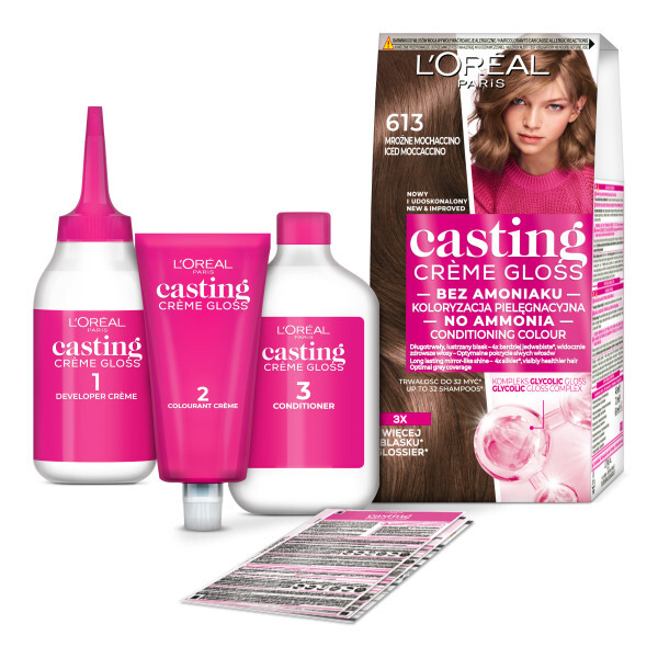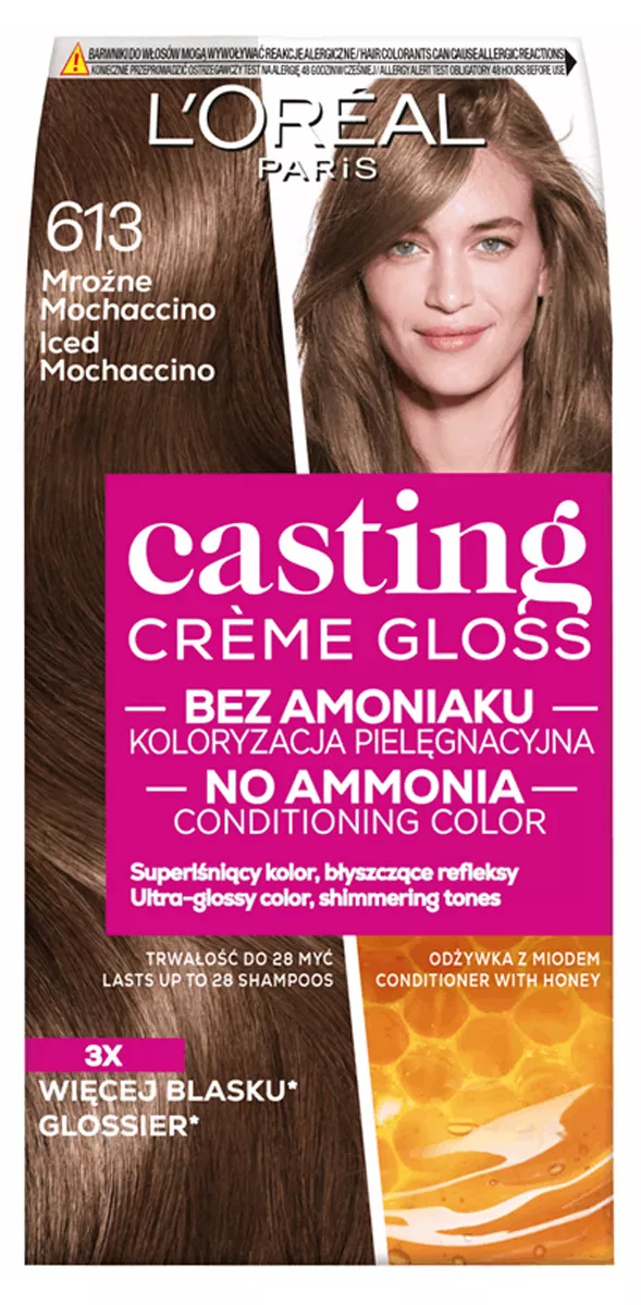 Kremowa formuła farby L'Oreal Paris Casting Crème Gloss w odcieniu 613 Mroźne mochaccino optymalnie pokrywa siwe włosy, nadając im piękny, naturalnie wyglądający kolor z wyraźnymi, lśniącymi refleksami oraz wyjątkowym połyskiem. Efekt koloryzacji utrzymuje się do 28 myć, co czyni ją idealnym wyborem dla osób poszukujących trwałego i intensywnego koloru. To numer 1 wśród farb bez amoniaku w Polsce, co potwierdzają dane L’Oréal za Nielsen z 2020 roku.