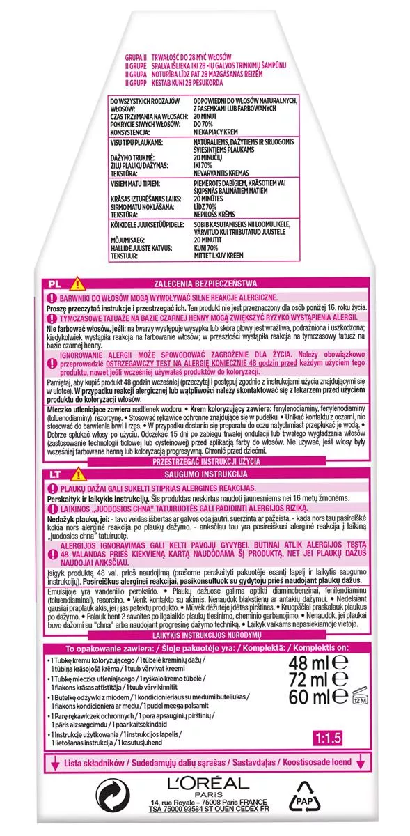 Przestrzegać instrukcji użycia znajdujących się wewnątrz opakowania. Zalecane jest wykonanie testu 48 godzin przed aplikacją, aby zapewnić bezpieczną koloryzację.