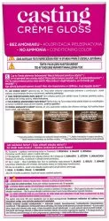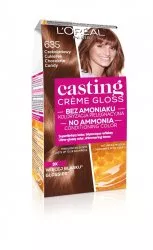L'Oreal Paris Casting Crème Gloss Farba do włosów 635 Czekoladowy cukierek oferuje kremową formułę, która skutecznie pokrywa siwe włosy, nadając im piękny, naturalnie wyglądający kolor. Efekt koloryzacji utrzymuje się do 28 myć, a włosy zyskują bogaty, lśniący połysk oraz wyraźne refleksy. Produkt ten zdobył pozycję nr 1 wśród farb bez amoniaku w Polsce, według badania L’Oréal za Nielsen, na podstawie wartościowych udziałów rynkowych w kategorii koloryzacji włosów w segmentach farb bez amoniaku w okresie 1-6.2020.