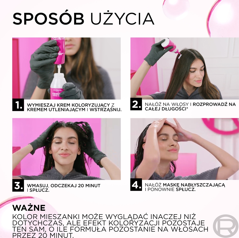 Przed użyciem należy dokładnie przeczytać instrukcję znajdującą się wewnątrz opakowania. Dla bezpiecznej koloryzacji zaleca się przeprowadzenie testu 48 godzin przed użyciem.
