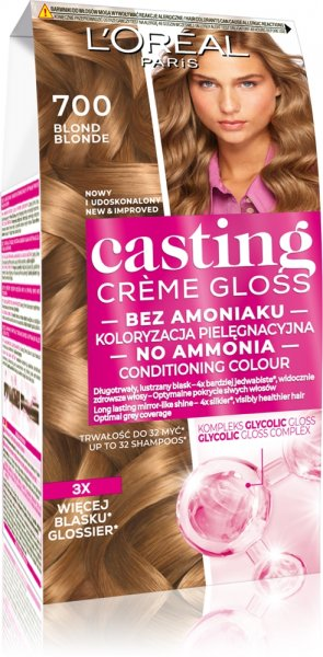 L'Oreal Paris Casting Crème Gloss Farba do włosów 700 Blond to doskonały wybór dla osób pragnących uzyskać naturalnie wyglądający kolor włosów. Kremowa formuła farby skutecznie pokrywa siwe włosy, nadając im bogaty odcień z wyraźnymi, lśniącymi refleksami. Efekt koloryzacji utrzymuje się aż do 28 myć, co sprawia, że produkt jest wyjątkowo trwały i ekonomiczny. L'Oreal Paris Casting Crème Gloss to numer jeden wśród farb bez amoniaku w Polsce, co potwierdzają dane Nielsen za okres 1-6.2020.