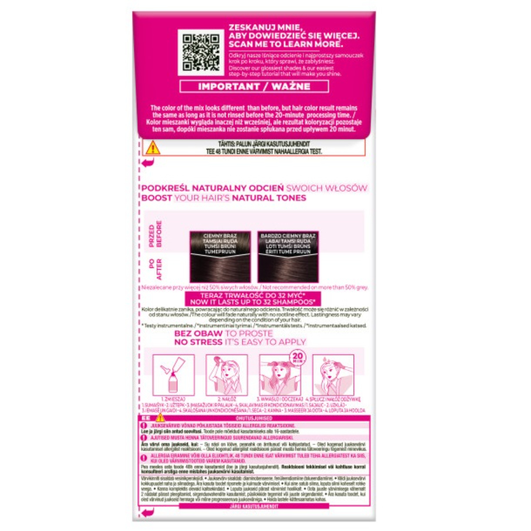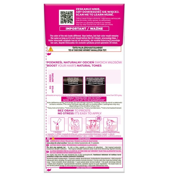 Przestrzegaj instrukcji użycia zawartych w opakowaniu. Przeprowadź test 48 godzin wcześniej, aby zapewnić bezpieczną koloryzację.