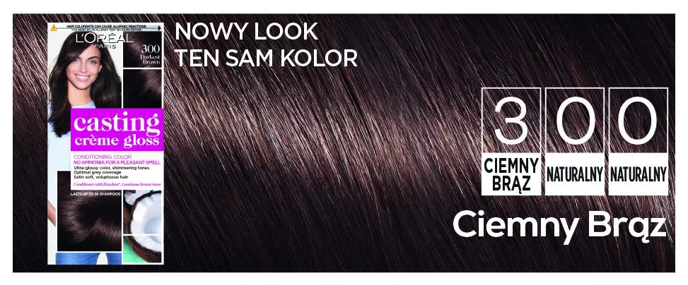 L'Oréal Paris Casting Crème Gloss to doskonała opcja dla osób poszukujących swojej pierwszej koloryzacji bez amoniaku. Ta farba do włosów podkreśla naturalną głębię koloru, nadając włosom pełnię blasku i lśniące refleksy. Dzięki subtelnemu efektowi koloryzacji ton w ton, kolor wypłukuje się stopniowo i równomiernie, co eliminuje problem z odrostami. Formuła jest łatwa w aplikacji i nie klei się, a przyjemny, owocowy zapach uprzyjemnia proces koloryzacji. Farba zapewnia optymalne pokrycie siwych włosów i zawiera odżywkę z miodem, która rozświetla włosy i wydobywa ich naturalne piękno. Włosy po koloryzacji są jedwabiste, miękkie i wyjątkowo lśniące, a efekt utrzymuje się do 28 myć. Odkryj nowy wymiar koloru z L'Oréal Paris!