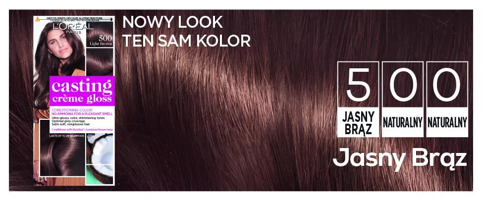 L'Oréal Paris Casting Crème Gloss to farba do włosów bez amoniaku, idealna na pierwszą koloryzację. Produkt wydobywa naturalną głębię koloru, nadając włosom blasku i lśniących refleksów. Dzięki subtelnemu efektowi koloryzacji ton w ton, kolor stopniowo i równomiernie się wypłukuje, co eliminuje efekt "odrostów". Farba jest łatwa w aplikacji, nie klei się i ma przyjemny, owocowy zapach. Zapewnia optymalne pokrycie siwych włosów, a zawarta w niej odżywka z miodem rozświetla włosy, czyniąc je jedwabistymi, miękkimi i wyjątkowo lśniącymi. Efekt koloryzacji utrzymuje się do 28 myć.