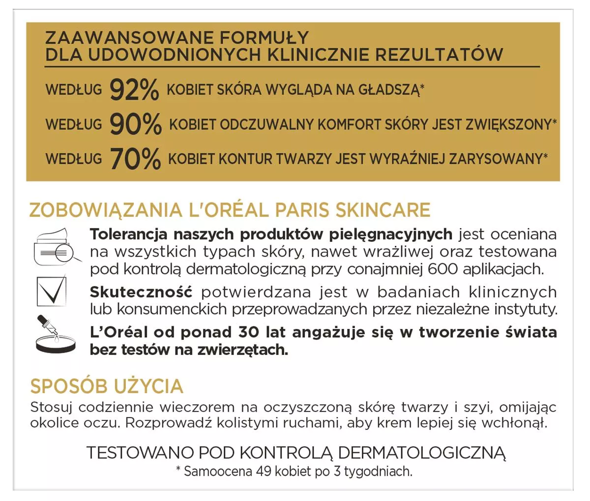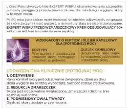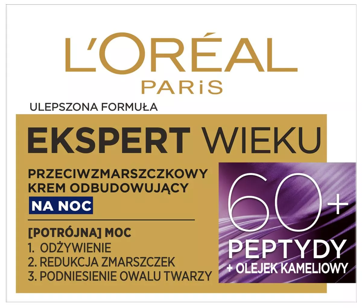 L'Oréal Paris stworzyło linię Ekspert Wieku, dedykowaną dla osób po 60. roku życia, które pragną dbać o młodszy wygląd skóry. Przeciwzmarszczkowy krem odbudowujący na noc 60+ oferuje skuteczne rozwiązanie dla skóry tracącej gęstość i wyraźność konturów. Dzięki formule wzbogaconej o peptydy oraz olejek kameliowy, krem zapewnia potrójną moc: odżywienia, redukcji zmarszczek oraz podniesienia owalu twarzy.