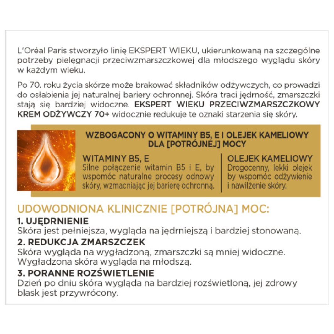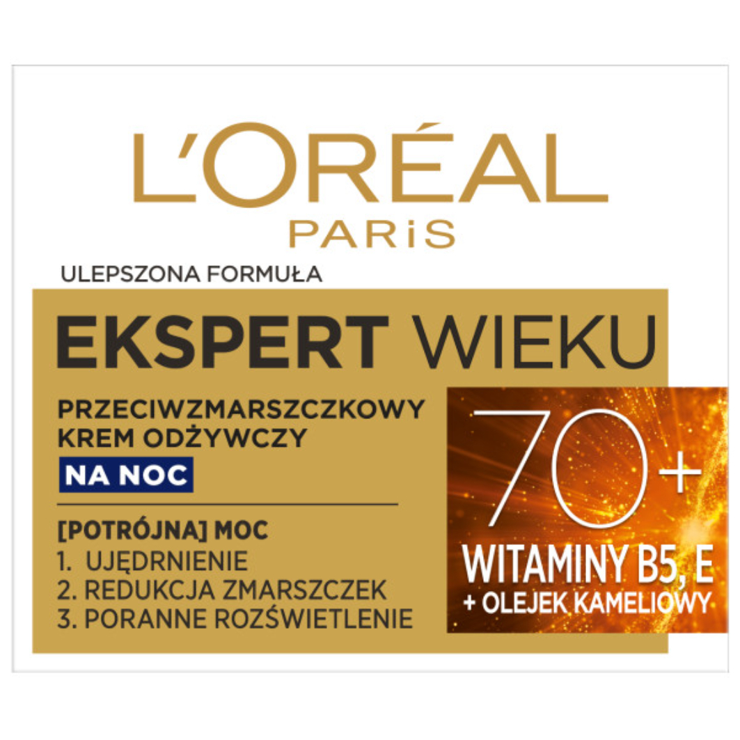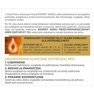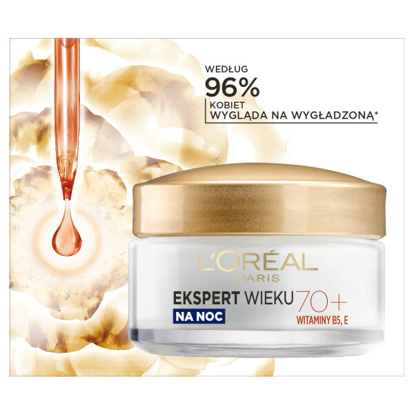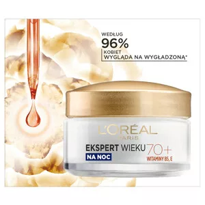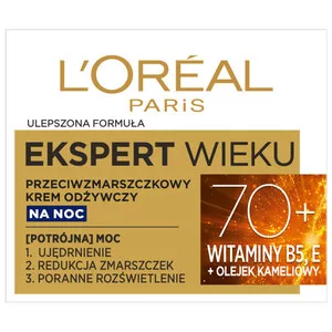 L'Oréal Paris Ekspert Wieku to specjalistyczna linia kosmetyków, stworzona z myślą o potrzebach skóry dojrzałej, szczególnie po 70. roku życia. Z wiekiem skóra może tracić składniki odżywcze, co osłabia jej naturalną barierę ochronną, prowadząc do utraty jędrności i bardziej widocznych zmarszczek. Przeciwzmarszczkowy krem odżywczy na noc 70+ widocznie redukuje oznaki starzenia, dzięki formule wzbogaconej o witaminy B5 i E oraz olejek kameliowy, które zapewniają potrójną moc: ujędrnienie, redukcję zmarszczek i poranne rozświetlenie.