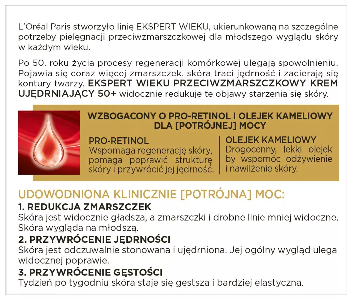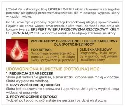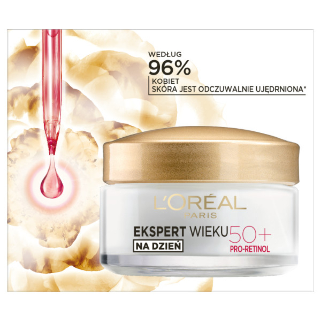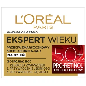 L'Oréal Paris Ekspert Wieku Przeciwzmarszczkowy krem ujędrniający na dzień 50+ to doskonałe rozwiązanie dla kobiet po 50. roku życia, które pragną zachować młodszy wygląd skóry. Z upływem czasu procesy regeneracyjne w skórze ulegają spowolnieniu, co prowadzi do pojawienia się zmarszczek i utraty jędrności. Ten krem, wzbogacony o pro-retinol oraz olejek kameliowy, skutecznie redukuje oznaki starzenia się skóry, przywracając jej jędrność i gęstość.