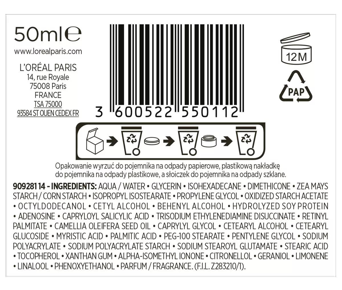 909281 14 - Aqua / Water • Glycerin • Isohexadecane • Dimethicone • Zea Mays Starch / Corn Starch • Isopropyl Isostearate • Propylene Glycol • Oxidized Starch Acetate • Octyldodecanol • Cetyl Alcohol • Behenyl Alcohol • Hydrolyzed Soy Protein • Adenosine • Capryloyl Salicylic Acid • Trisodium Ethylenediamine Disuccinate • Retinyl Palmitate • Camellia Oleifera Seed Oil • Caprylyl Glycol • Cetearyl Alcohol • Cetearyl Glucoside • Myristic Acid • Palmitic Acid • Peg-100 Stearate • Pentylene Glycol • Sodium Polyacrylate • Sodium Polyacrylate Starch • Sodium Stearoyl Glutamate • Stearic Acid • Tocopherol • Xanthan Gum • Alpha-isomethyl Ionone • Citronellol • Geraniol • Limonene • Linalool • Phenoxyethanol • Parfum / Fragrance (f.i.l. Z283210/1).