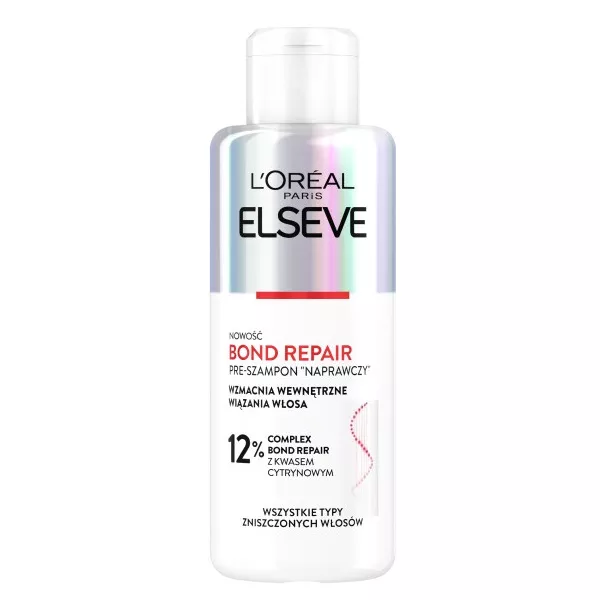 Pre-szampon naprawczy "Bond Repair" od L'Oreal Paris Elseve jest pierwszym krokiem w intensywnej pielęgnacji wzmacniającej wewnętrzne wiązania włosa. Dzięki formule wzbogaconej o 12% Bond Repair Complex z kwasem cytrynowym, produkt odbudowuje i rekonstruuje włókno włosa, wzmacniając je od wewnątrz. Włosy składają się z milionów wiązań, które nadają im strukturę i siłę, a gdy pękają wskutek szczotkowania, rozjaśniania, wysokiej temperatury czy farbowania, stają się słabe i zniszczone. Formuły Elseve z kwasem cytrynowym przenikają przez powierzchnię włosa, aby odtworzyć i wzmocnić zerwane wiązania.
