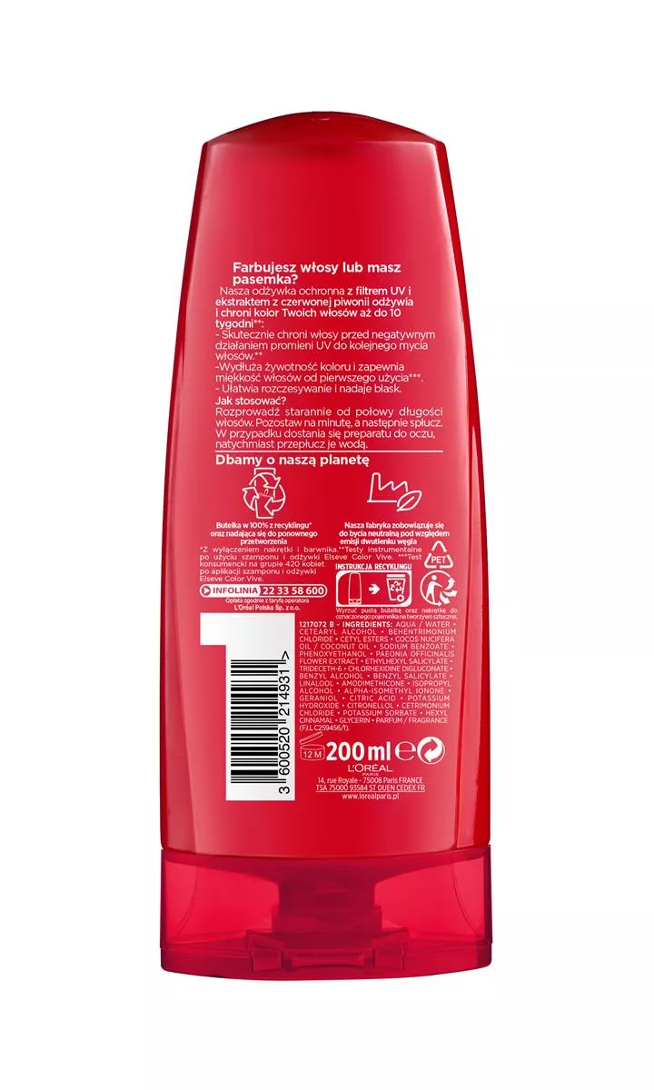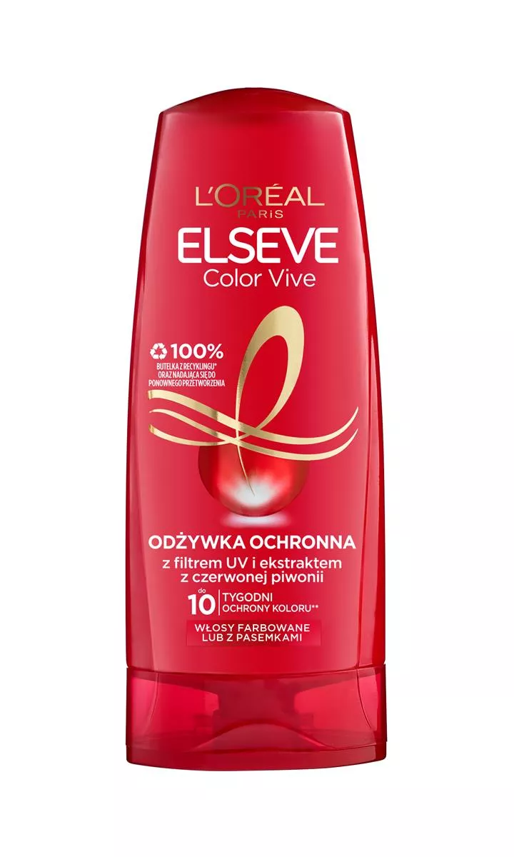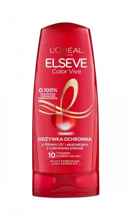 Masz poczucie, że intensywność koloru Twoich włosów po farbowaniu za krótko się utrzymuje? W miarę upływu czasu, pozbawiony ochrony kolor szybko traci blask i zmienia się jego ton. L'Oreal Paris Elseve Color-Vive Odżywka Ochronna do włosów farbowanych to idealne rozwiązanie, które pomoże Ci w przedłużeniu trwałości koloru aż do 10 tygodni*. Dzięki ekstraktowi z czerwonej piwonii i filtrowi UV, ta odżywka nie tylko chroni kolor, ale także odżywia włosy, nadając im piękny blask.