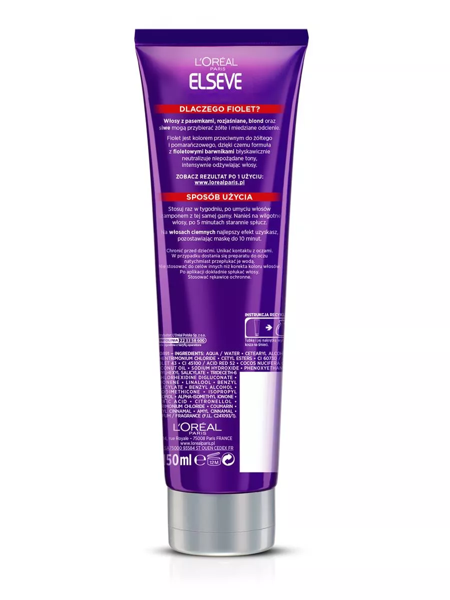 Twoje blond i rozjaśniane włosy nie wyglądają już tak pięknie jak po koloryzacji? Z czasem na włosach mogą pojawić się niepożądane żółte i miedziane tony. Bez obaw! L'Oreal Paris Elseve Color-Vive Purple Maska to idealne rozwiązanie dla blondynek, osób z siwymi włosami lub jasnymi pasemkami. Dzięki fioletowym barwnikom maska skutecznie neutralizuje niepożądane odcienie, jednocześnie intensywnie odżywiając włosy.