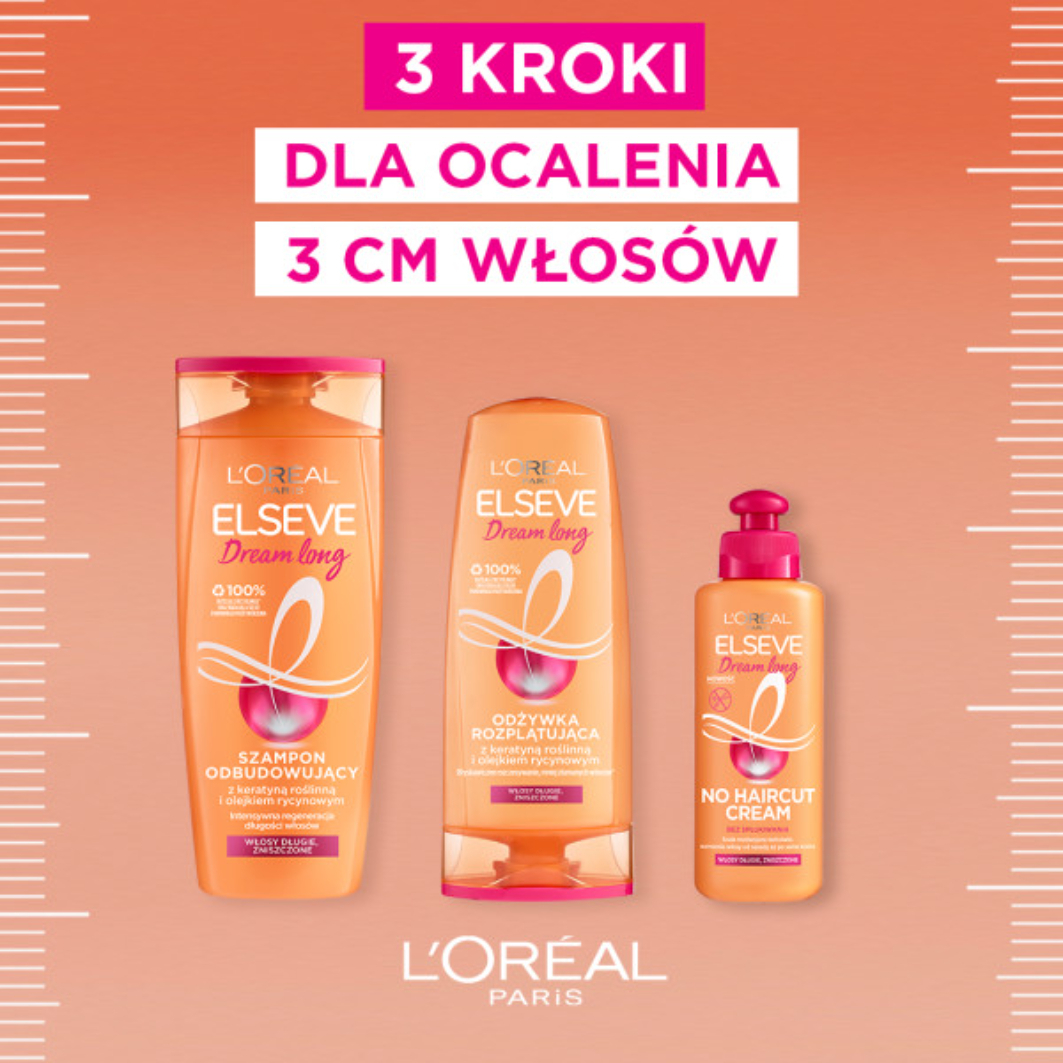 L'Oreal Paris Elseve Dream Long No Haircut Cream to wyjątkowa odżywka w kremie bez spłukiwania, stworzona specjalnie dla długich i zniszczonych włosów. Dzięki swojej innowacyjnej formule, w zaledwie 8 sekund pozwala na błyskawiczną metamorfozę włosów, zapewniając im intensywny blask oraz gładkość aż po same końce. Technologia lamelarna wypełnia zniszczone włókna włosów, gwarantując wyjątkową miękkość i łatwość w stylizacji.