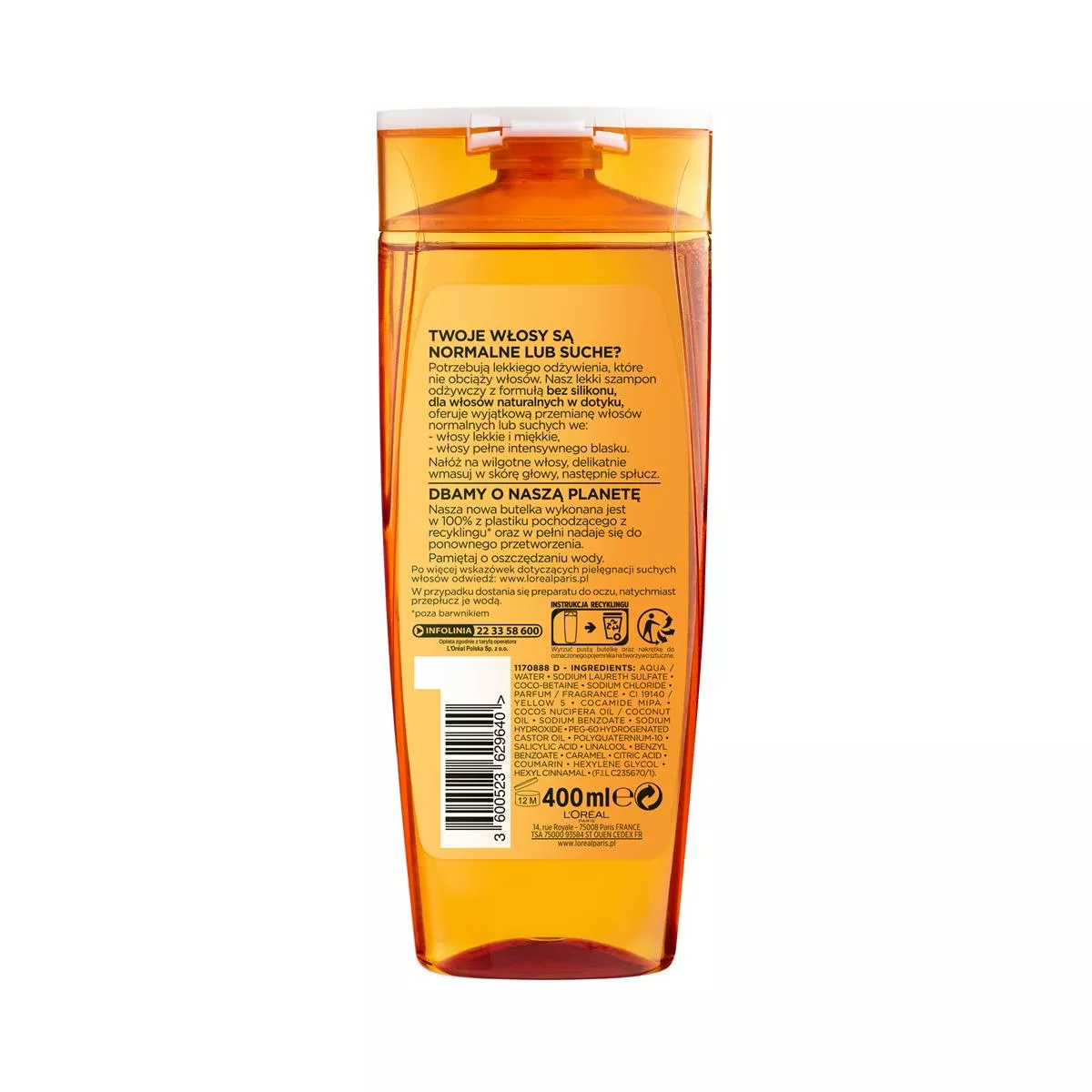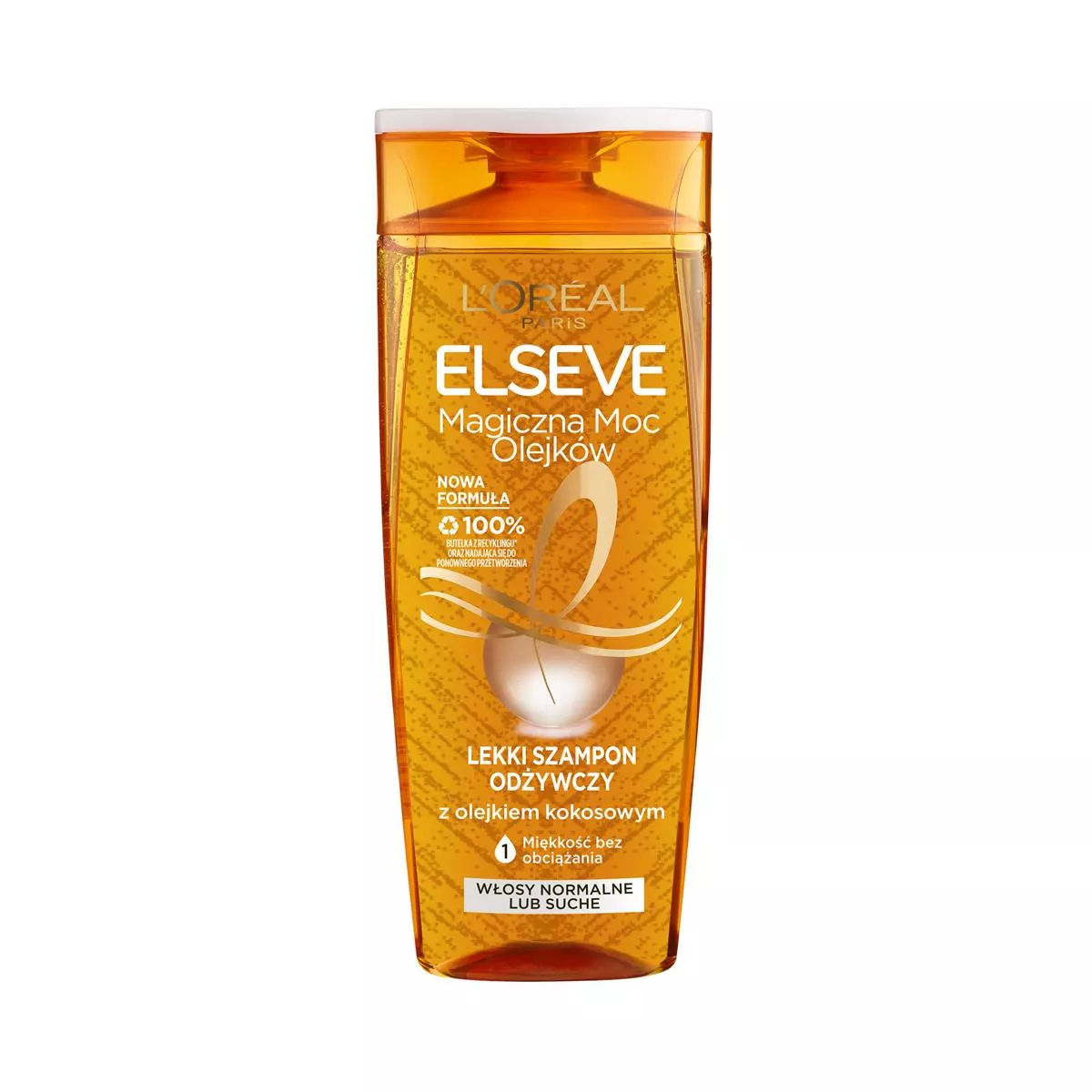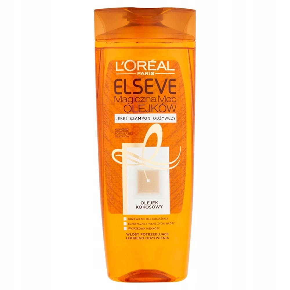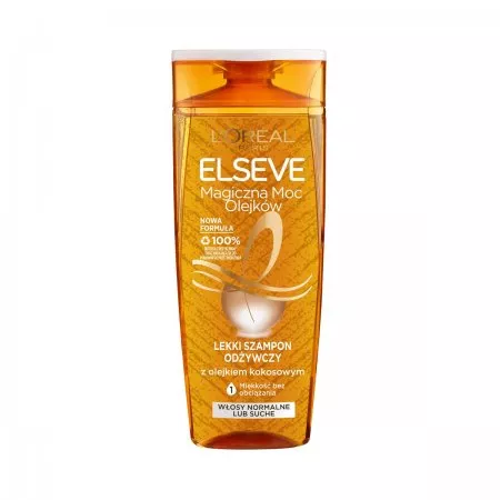Twoje włosy są suche, szorstkie i pozbawione życia? L'Oreal Paris Elseve Magiczna Moc Olejków Lekki Szampon Odżywczy z olejkiem kokosowym to idealne rozwiązanie dla włosów normalnych lub suchych. Jego lekka, przejrzysta formuła, wolna od silikonu, zapewnia naturalne uczucie włosów i wyjątkową przemianę. Wzbogacony o olejek kokosowy, odżywia włókna włosów bez ich obciążania, zapewniając efekt lekkich, miękkich i pełnych życia włosów. Wygładza włókna włosów, aby wydobyć intensywny blask i nadaje włosom subtelny, zmysłowy kokosowy zapach. Dodatkowo, butelka wykonana jest w 100% z plastiku pochodzącego z recyklingu* i nadaje się do ponownego przetworzenia.