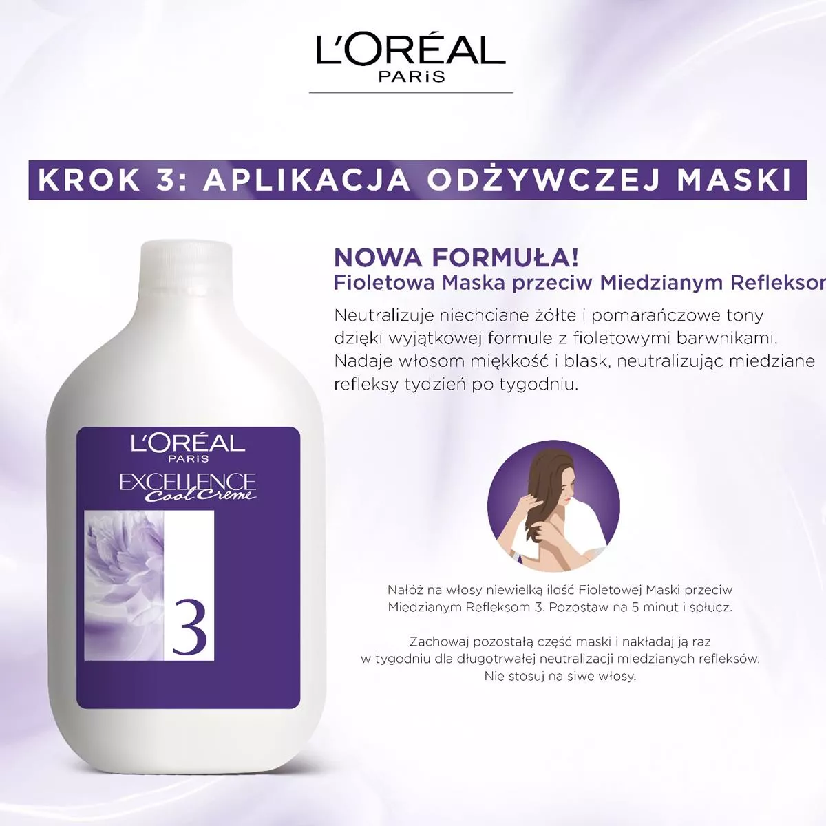 - Fioletowa maska przeciw miedzianym refleksom, która nadaje włosom miękkość i blask, neutralizując miedziane refleksy tydzień po tygodniu.