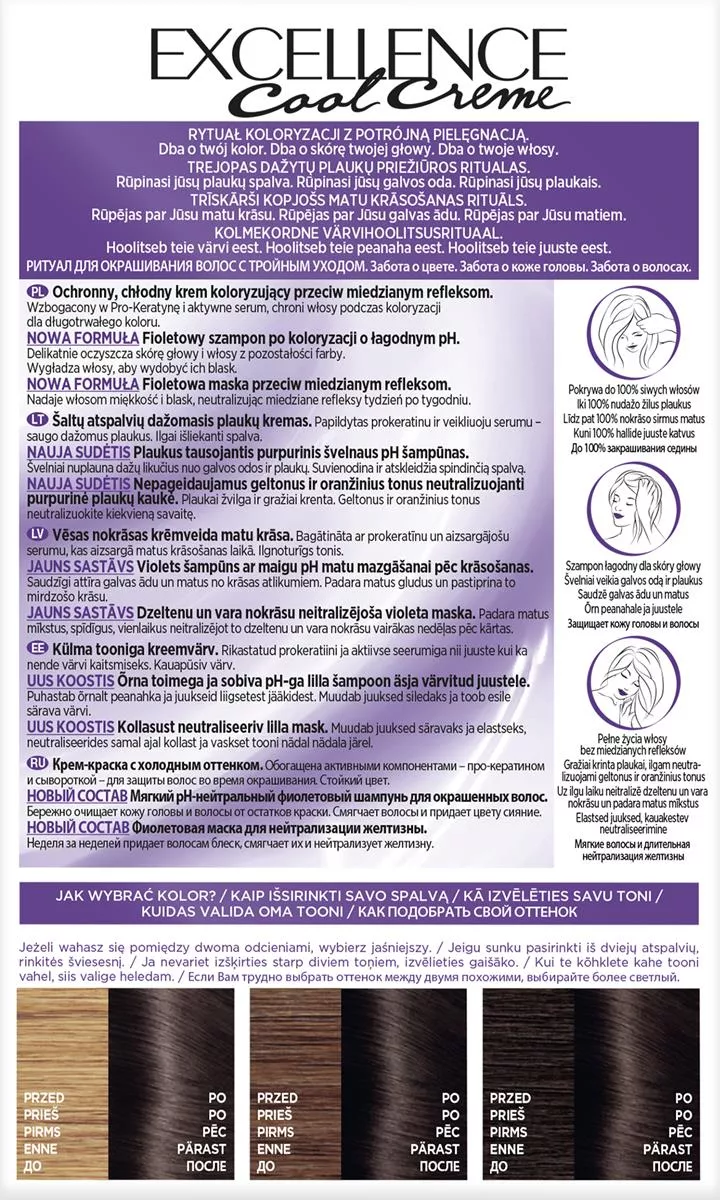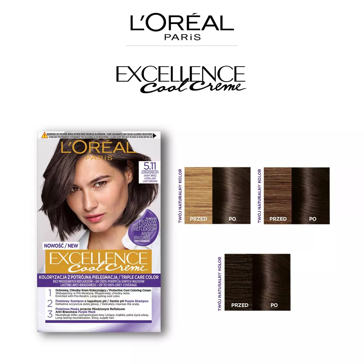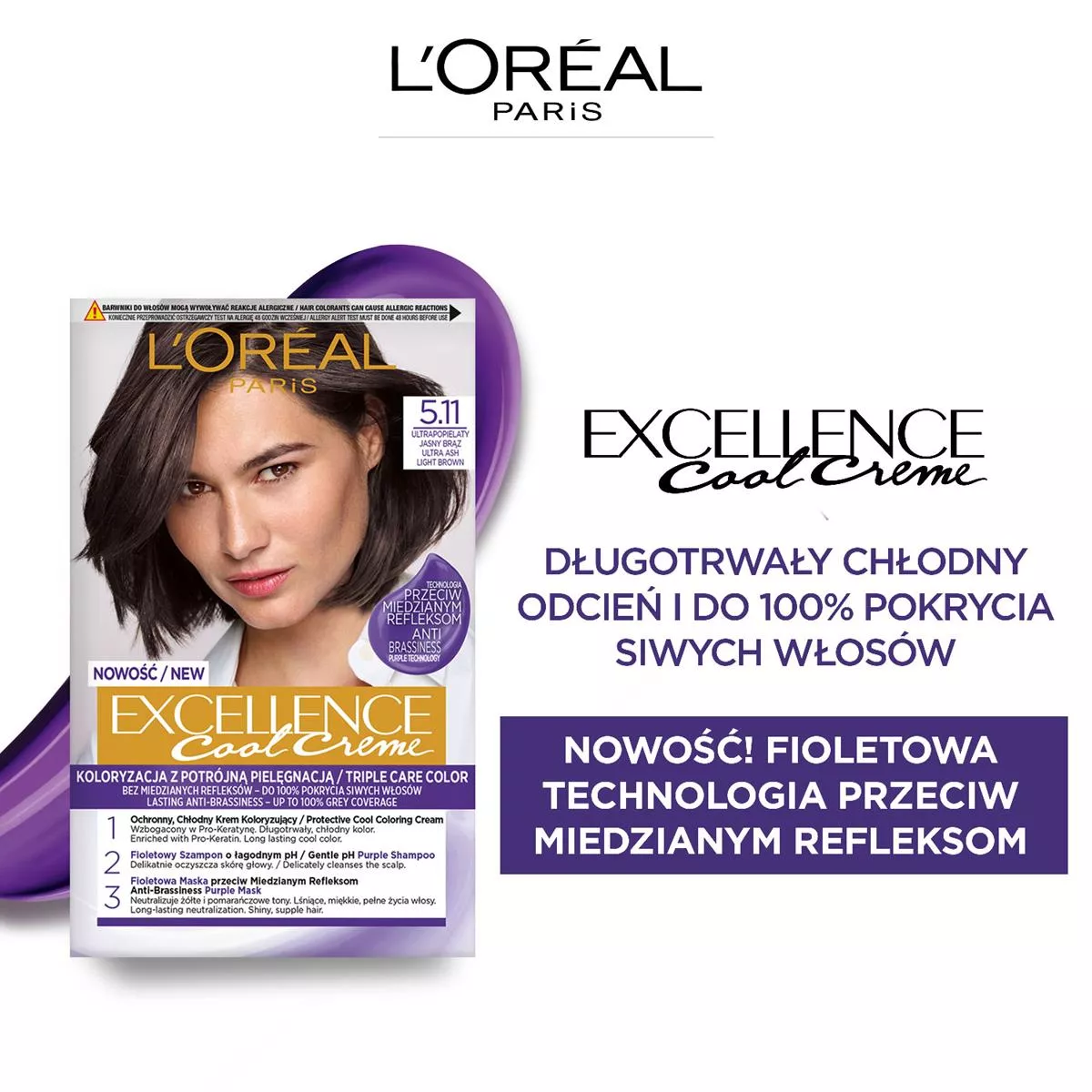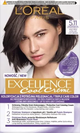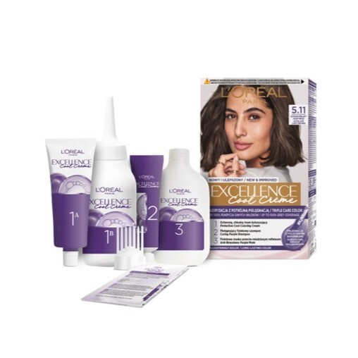 Odkryj trwałą farbę do włosów L'Oreal Paris Excellence Cool Creme w odcieniu 5.11 Ultrapopielaty Jasny Brąz, która oferuje koloryzację z potrójną pielęgnacją, teraz wzbogaconą o fioletową technologię przeciw miedzianym refleksom. Ciesz się chłodnymi odcieniami, które pozostają na dłużej, oraz do 100% pokryciem siwych włosów.