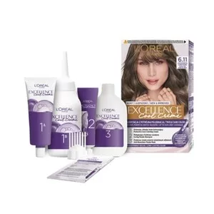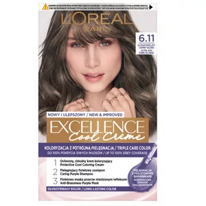 L'Oreal Paris Excellence Cool Creme Trwała Farba do Włosów 6.11 Ultrapopielaty Ciemny Blond to innowacyjna koloryzacja, która łączy potrójną pielęgnację z zaawansowaną fioletową technologią. Zapewnia chłodne odcienie, które utrzymują się na dłużej, oraz daje do 100% pokrycia siwych włosów. Formuła wzbogacona o Pro-Keratynę i aktywne serum chroni włosy podczas koloryzacji, a ultra chłodne pigmenty zapewniają niezwykle chłodny kolor.
