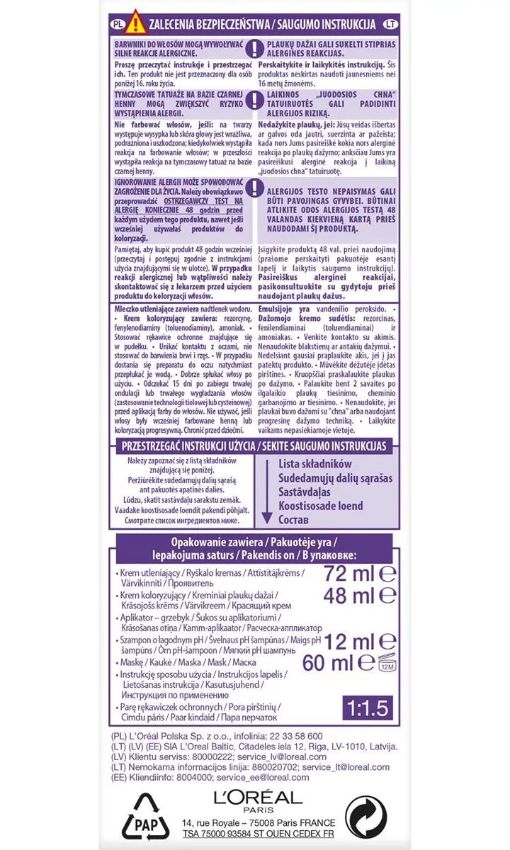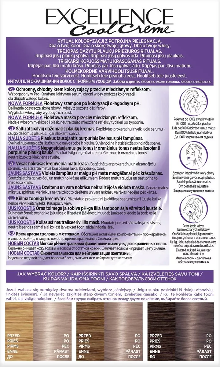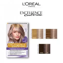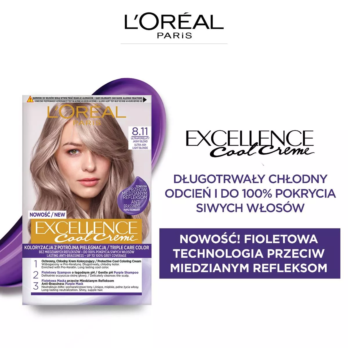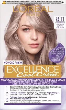 L'Oreal Paris Excellence Cool Creme Trwała Farba do Włosów 8.11 Ultrapopielaty Jasny Blond oferuje innowacyjną koloryzację z potrójną pielęgnacją, teraz wzbogaconą technologią fioletową przeciwko miedzianym refleksom. Dzięki temu odcienie pozostają chłodne na dłużej, a produkt zapewnia do 100% pokrycia siwych włosów.