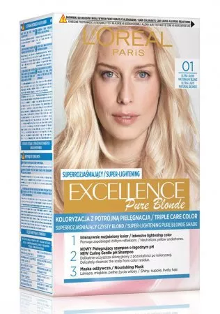 Farba do włosów L'Oreal Paris Excellence Creme w odcieniu 01 Superjasny blond naturalny to doskonały wybór dla tych, którzy pragną zaawansowanej ochrony włosów i intensywnego koloru. Produkt ten gwarantuje potrójną ochronę koloru, wzmacnia i pielęgnuje pasma, a także chroni włosy przed uszkodzeniami podczas rozczesywania. Pokrywa do 100% siwych włosów, zapewniając bogaty, długotrwały kolor oraz miękkość włosów.
