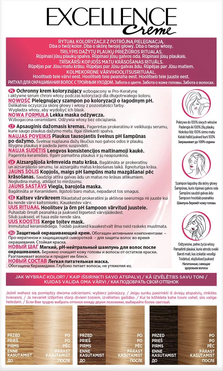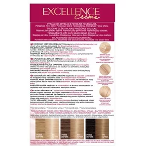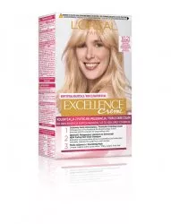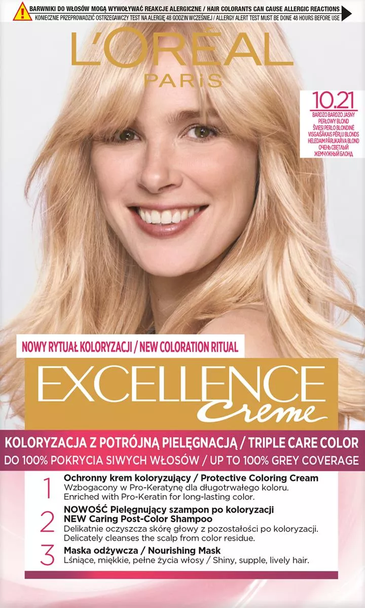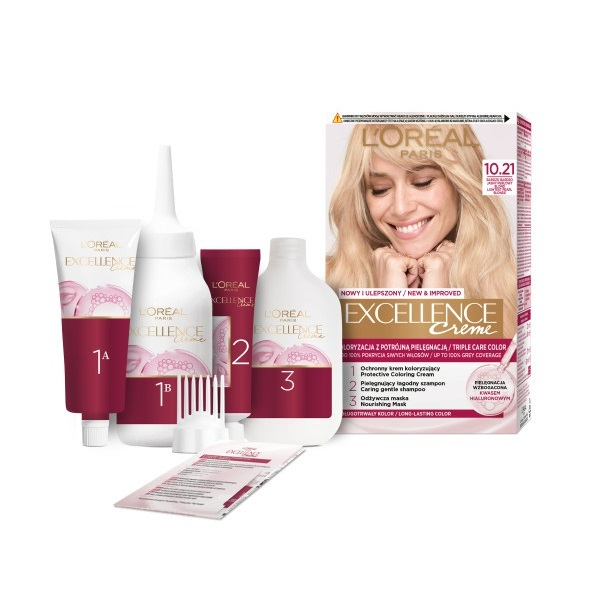 Farba do włosów L'Oreal Paris Excellence Creme 10.21 Bardzo bardzo jasny perłowy blond została stworzona, by zapewnić zaawansowaną ochronę włosów oraz intensywny, długotrwały kolor. Idealna dla osób szukających skutecznego pokrycia siwych włosów oraz chcących cieszyć się bogatym, lśniącym odcieniem.