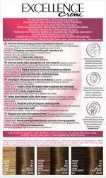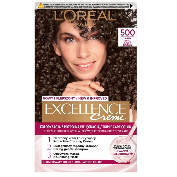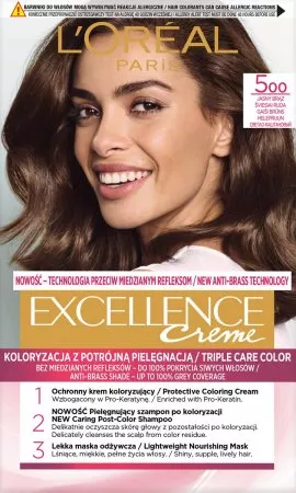 Farba do włosów L'Oreal Paris Excellence Creme w odcieniu 5 Jasny Brąz jest doskonałym wyborem dla tych, którzy pragną zaawansowanej ochrony włosów i koloru. Oferuje ona potrójną ochronę koloru, jednocześnie wzmacniając i pielęgnując pasma. Produkt zapewnia pełne pokrycie siwych włosów, bogaty, długotrwały kolor oraz dodaje włosom miękkości.