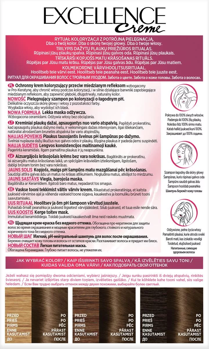 Wybierz swój idealny odcień. Efekt kolorystyczny zależy od Twojego naturalnego koloru. Jeśli wahasz się pomiędzy dwoma odcieniami, wybierz jaśniejszy.
