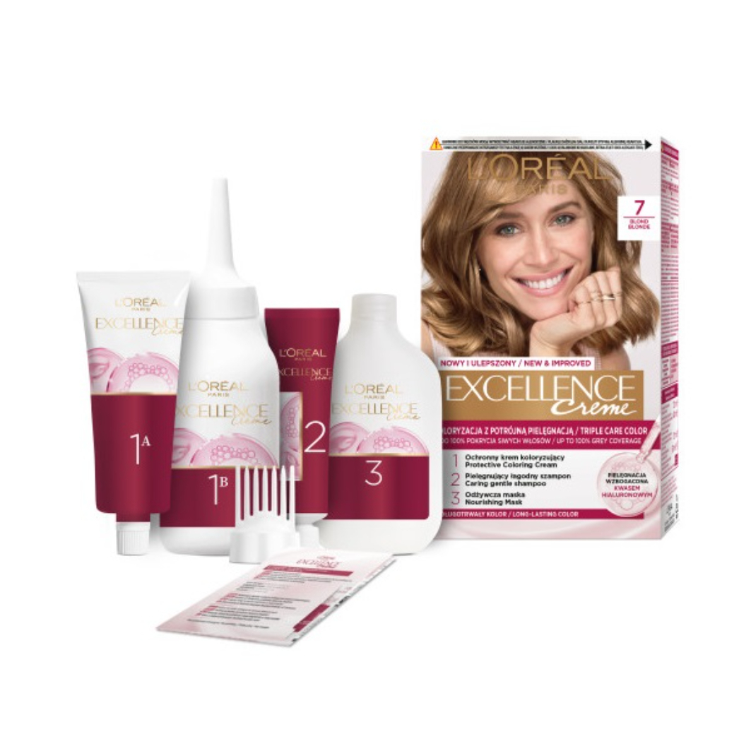 Wybierz L'Oreal Paris Excellence Creme 7 Blond i ciesz się zdrowym, lśniącym kolorem oraz jedwabiście miękkimi włosami dzięki zaawansowanej formule pielęgnacyjnej.