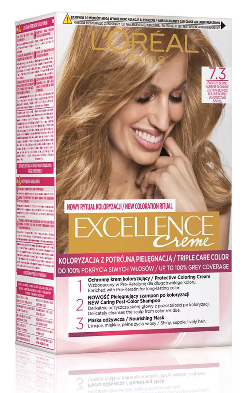 Farba do włosów L'Oreal Paris Excellence Creme 7.3 Złocisty Blond to idealny wybór dla tych, którzy pragną uzyskać piękny, lśniący kolor oraz zaawansowaną ochronę włosów. Dzięki unikalnej formule, farba zapewnia potrójną ochronę koloru i skutecznie wzmacnia pasma, jednocześnie chroniąc je przed uszkodzeniami podczas rozczesywania. Produkt doskonale pokrywa do 100% siwych włosów, dając bogaty, długotrwały kolor i jedwabistą miękkość.