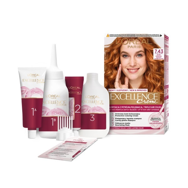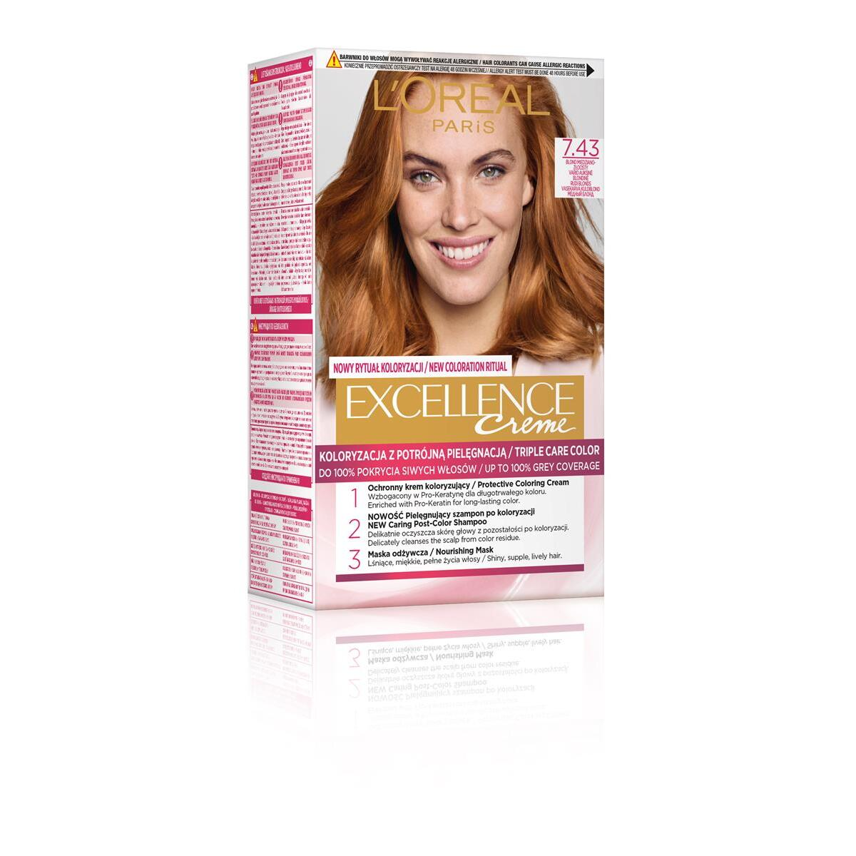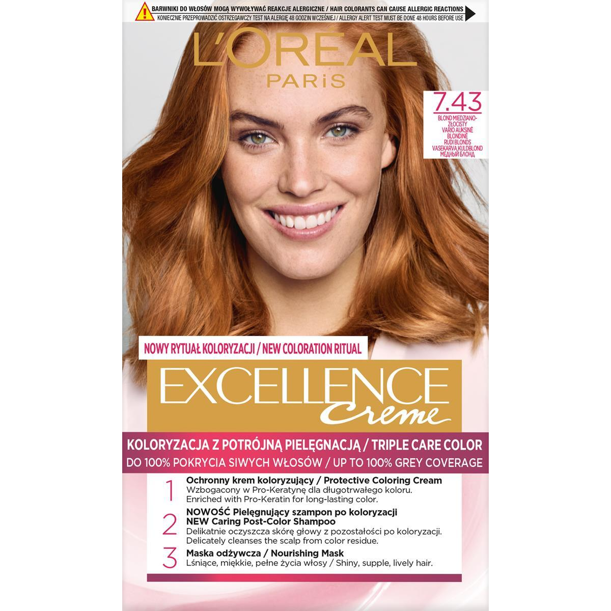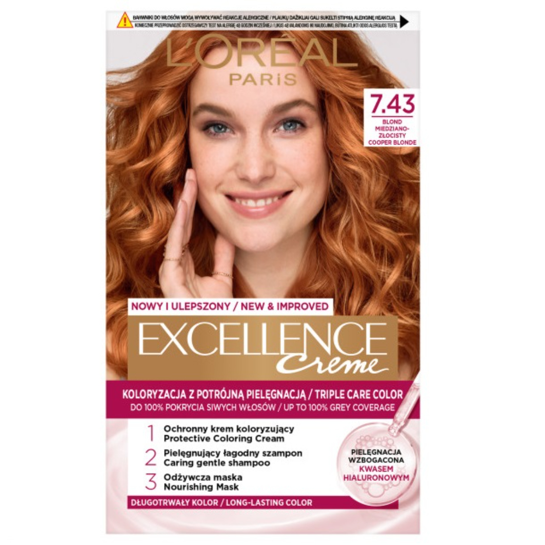 Farba do włosów L'Oreal Paris Excellence Creme w odcieniu 7.43 Blond miedziano-złocisty to doskonały wybór dla osób pragnących zaawansowanej ochrony włosów i intensywnego koloru. Dzięki innowacyjnej formule, farba nie tylko zapewnia piękny kolor, ale także wzmacnia i pielęgnuje włosy.