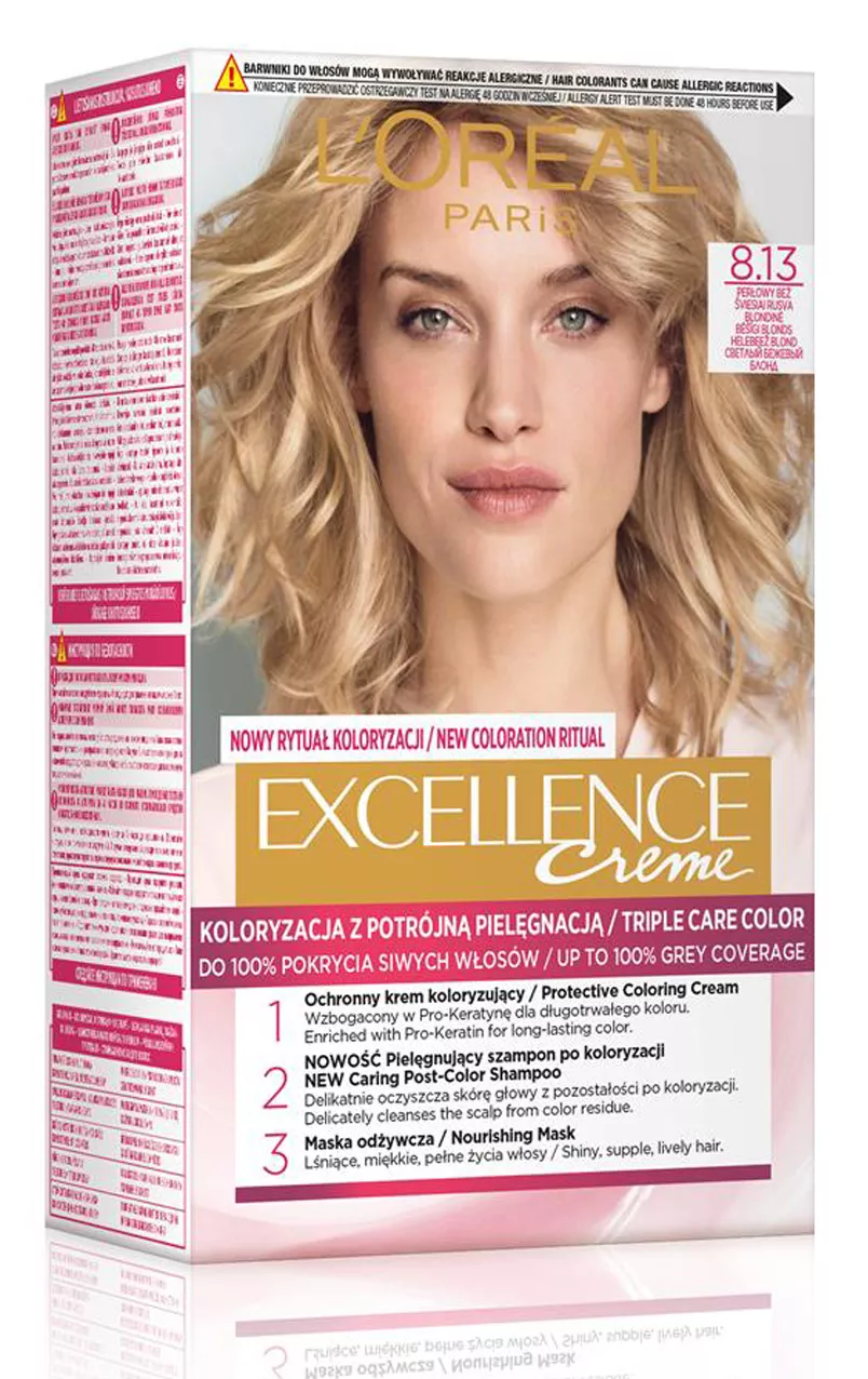 Farba do włosów L'Oreal Paris Excellence Creme 8.13 Perłowy beż została stworzona z myślą o zaawansowanej ochronie włosów i trwałym kolorze. Dzięki unikalnej formule, produkt nie tylko nadaje włosom głęboki, bogaty kolor, ale również skutecznie je pielęgnuje i chroni.