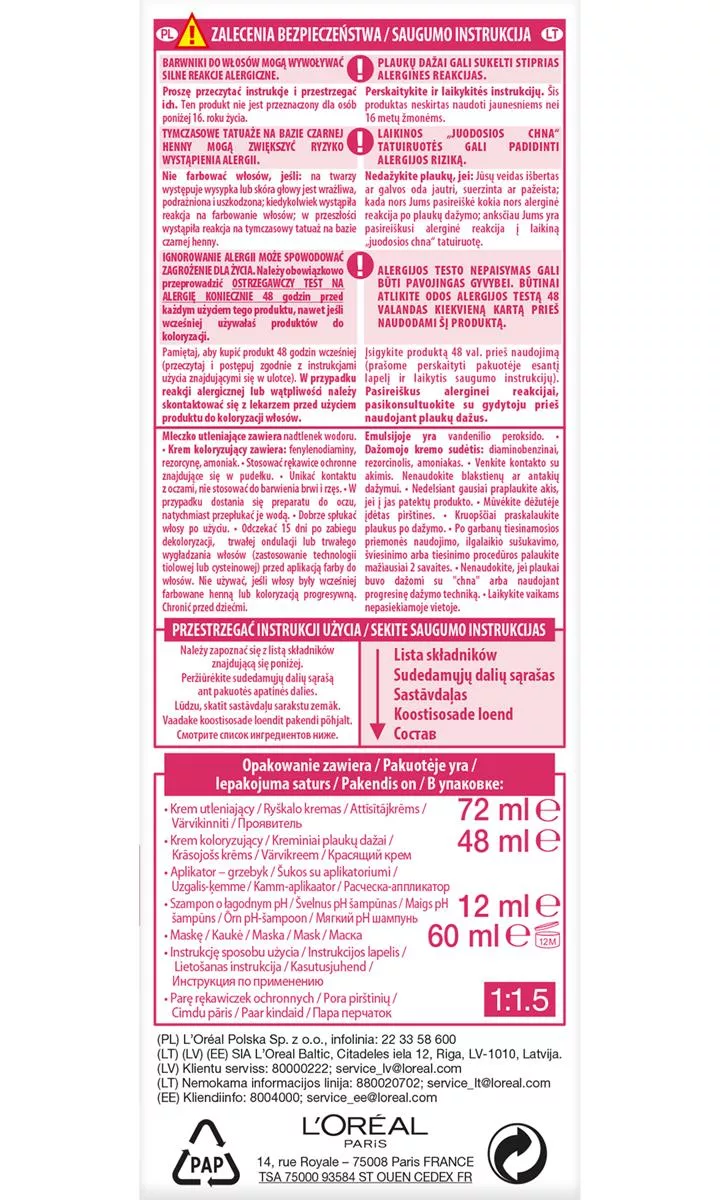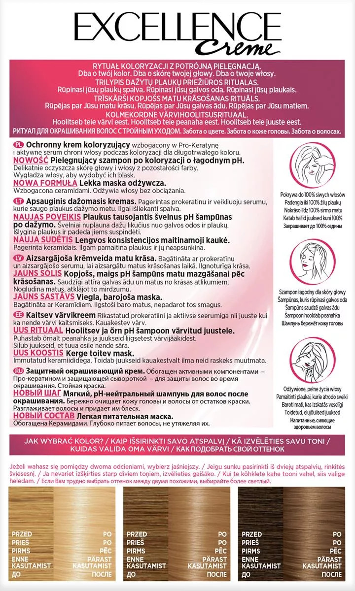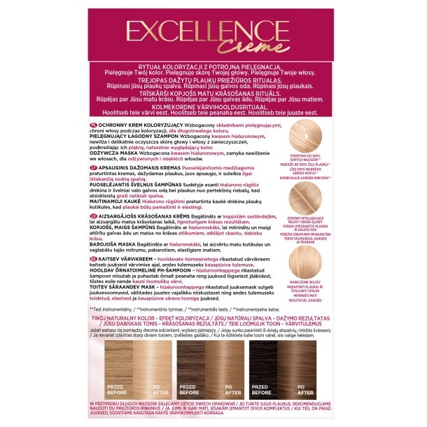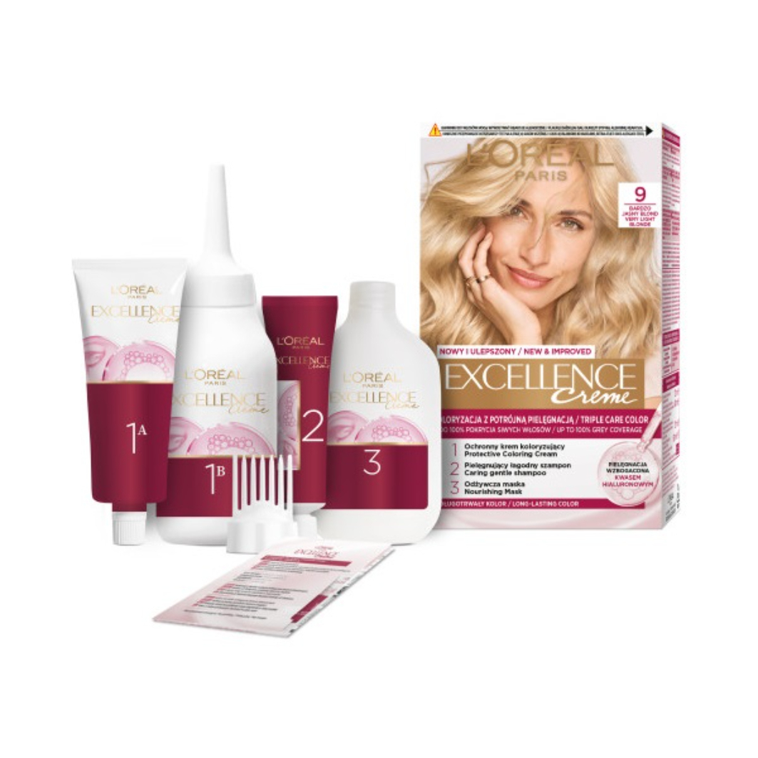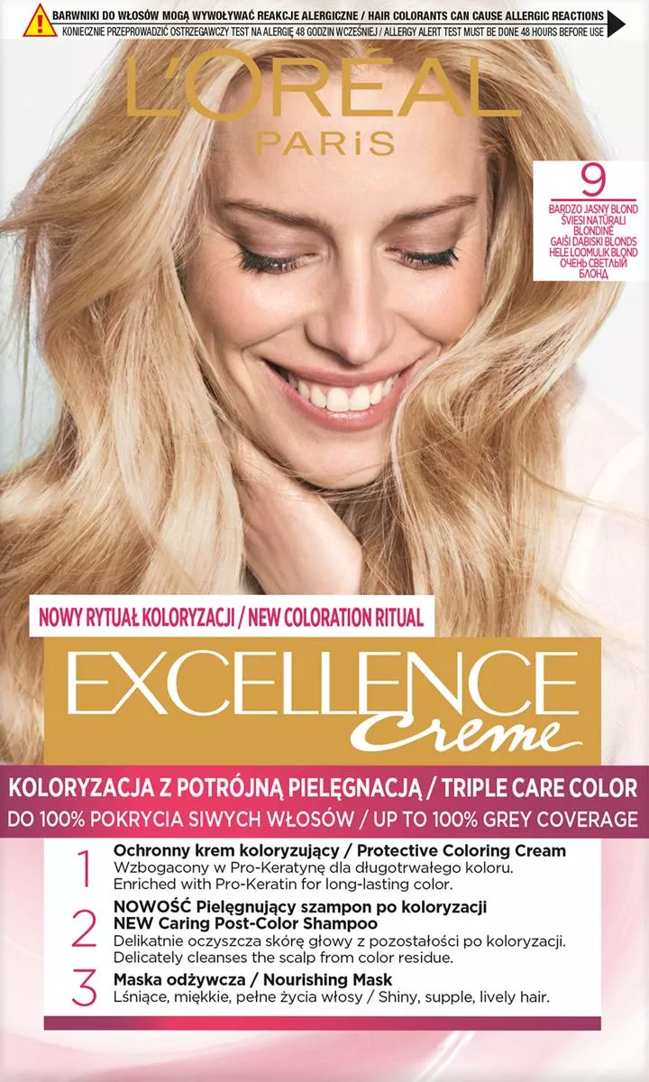Farba do włosów L'Oreal Paris Excellence Creme 9 Bardzo jasny blond to produkt stworzony dla zaawansowanej ochrony włosów i koloru. Dzięki innowacyjnej formule, zapewnia potrójną ochronę koloru, wzmacnia i pielęgnuje pasma oraz chroni przed uszkodzeniami podczas rozczesywania. Jest idealnym rozwiązaniem dla tych, którzy chcą pokryć do 100% siwych włosów i cieszyć się bogatym, długotrwałym kolorem.