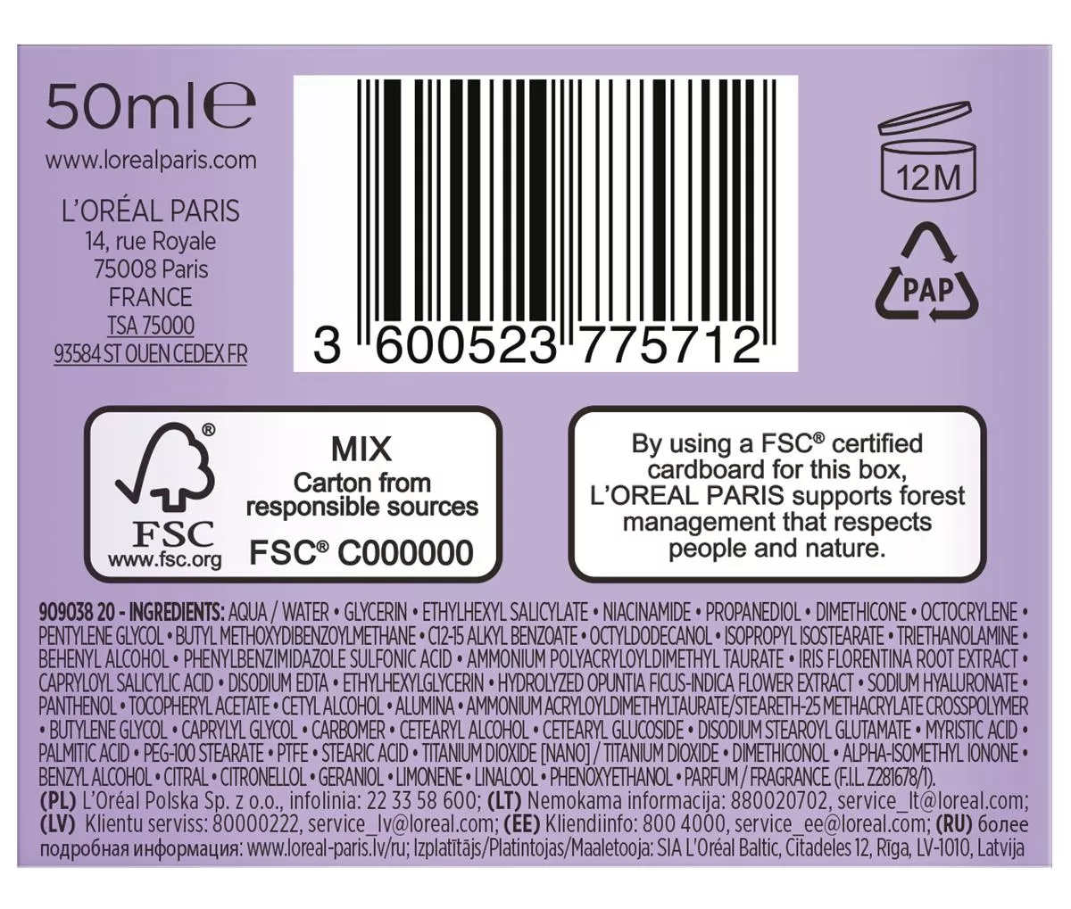 909038 20 - Aqua / Water, Glycerin, Ethylhexyl Salicylate, Niacinamide, Propanediol, Dimethicone, Octocrylene, Pentylene Glycol, Butyl Methoxydibenzoylmethane, C12-15 Alkyl Benzoate, Octyldodecanol, Isopropyl Isostearate, Triethanolamine, Behenyl Alcohol, Phenylbenzimidazole Sulfonic Acid, Ammonium Polyacryloyldimethyl Taurate, Iris Florentina Root Extract, Capryloyl Salicylic Acid, Disodium Edta, Ethylhexylglycerin, Hydrolyzed Opuntia Ficus-indica Flower Extract, Sodium Hyaluronate, Panthenol, Tocopheryl Acetate, Cetyl Alcohol, Alumina, Ammonium Acryloyldimethyltaurate/steareth-25 Methacrylate Crosspolymer, Butylene Glycol, Caprylyl Glycol, Carbomer, Cetearyl Alcohol, Cetearyl Glucoside, Disodium Stearoyl Glutamate, Myristic Acid, Palmitic Acid, Peg-100 Stearate, Ptfe, Stearic Acid, Titanium Dioxide [nano] / Titanium Dioxide, Dimethiconol, Alpha-isomethyl Ionone, Benzyl Alcohol, Citral, Citronellol, Geraniol, Limonene, Linalool, Phenoxyethanol, Parfum / Fragrance (f.i.l. Z281678/1).