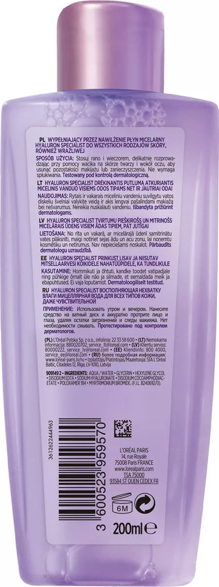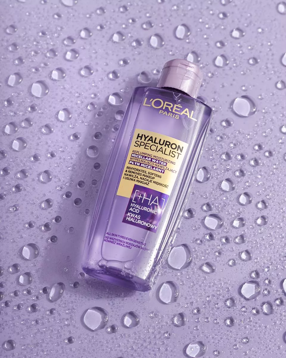 Laboratoria L’Oréal Paris prezentują L'Oreal Paris Hyaluron Specialist Wypełniająco-nawilżający płyn micelarny, który przywraca nawilżenie i wygładza pierwsze oznaki starzenia się skóry. Ten wyjątkowy płyn micelarny, wzbogacony kwasem hialuronowym, odpowiada na potrzeby kobiet pragnących zachować młody i świeży wygląd swojej cery. Produkt nawilża, nadaje miękkość skórze oraz skutecznie usuwa makijaż i zanieczyszczenia. Jest odpowiedni dla wszystkich rodzajów skóry, w tym skóry wrażliwej.