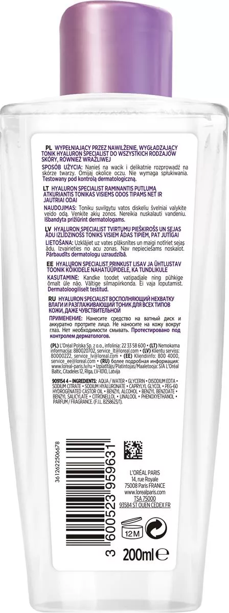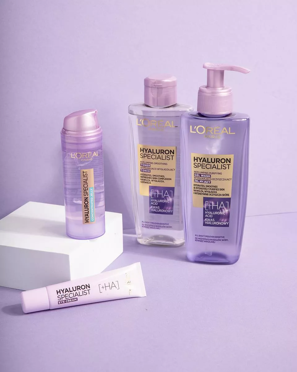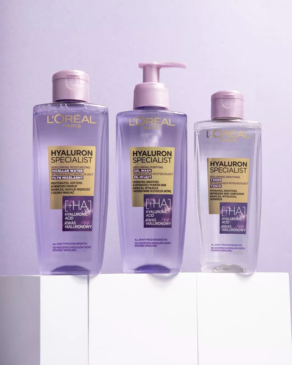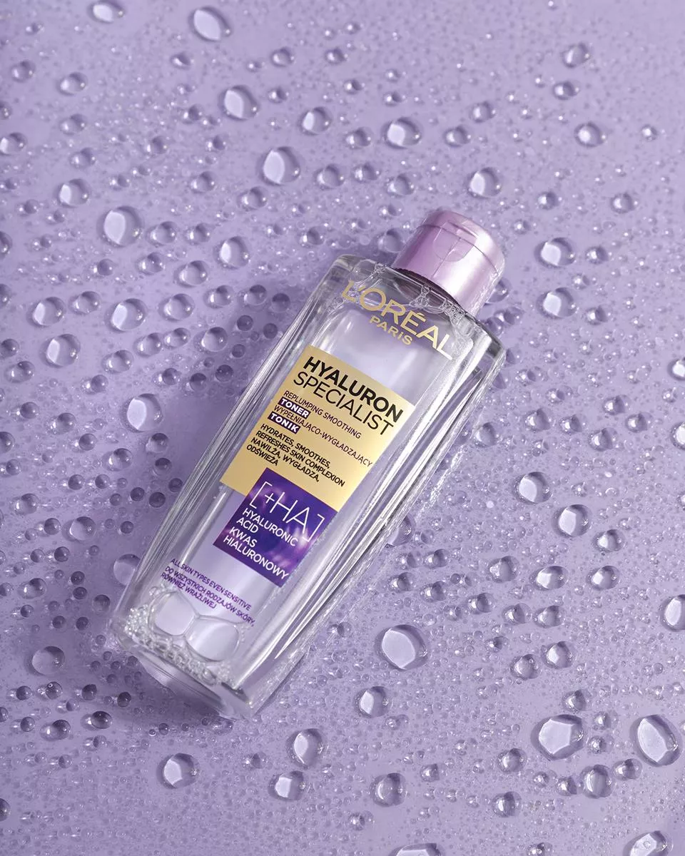 Aby przedłużyć młody wygląd i komfort skóry po 25. roku życia, laboratoria L’Oréal Paris stworzyły wypełniająco-wygładzający tonik Hyaluron Specialist. Tonik ten, dzięki swojej formule wzbogaconej o kwas hialuronowy, nawilża, tonizuje i wygładza powierzchnię skóry, pozostawiając ją komfortową i odświeżoną. Skóra staje się nawilżona, elastyczna i wygląda na wygładzoną. Kwas hialuronowy, naturalnie występujący w naszej skórze, działa jak gąbka wiążąc cząsteczki wody, co wspiera utrzymanie odpowiedniego poziomu nawilżenia. Po 25 roku życia jego ilość w skórze zaczyna spadać, dlatego warto sięgnąć po ten produkt. Tonik jest odpowiedni dla wszystkich rodzajów skóry, również wrażliwej.