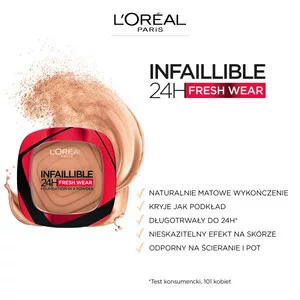 Odkryj L'Oreal Paris Infaillible 24H Fresh Wear Foundation in a Powder - podkład, który zdobył serca internautów. Działa jak płynny podkład, zapewniając nieskazitelne wykończenie przy jednym pociągnięciu. Ten podkład w pudrze oferuje długotrwały efekt do 24 godzin*, dzięki czemu Twoja skóra wygląda świeżo przez cały dzień. Formuła wzbogacona ultralekkimi pigmentami gwarantuje naturalnie matowe wykończenie, a produkt jest dostępny w czterech odcieniach. To nie tylko puder - to rewolucyjny podkład w pudrze. Odporny na ścieranie, pot i wodę, L'Oreal Paris Infaillible podbił internet!