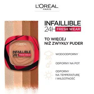 Odkryj L'Oreal Paris Infaillible 24H Fresh Wear Foundation in a Powder w odcieniu 140 Golden Beige. To puder matujący, który zdobył popularność w sieci, oferując krycie jak płynny podkład z nieskazitelnym efektem już po jednym pociągnięciu. Ciesz się długotrwałym efektem do 24 godzin, potwierdzonym przez test konsumencki na 101 kobietach. To więcej niż zwykły puder – to prawdziwy podkład w pudrze!