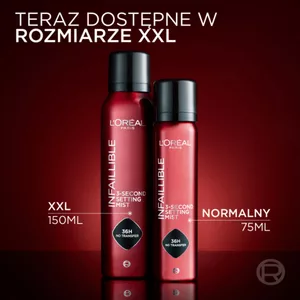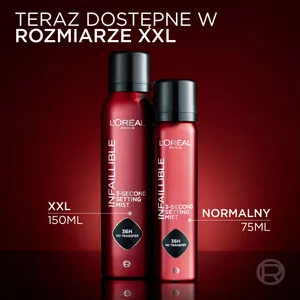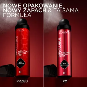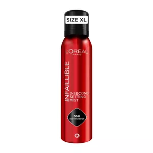 Odkryj L'Oreal Paris Infaillible 3-Second Setting Mist – 3-sekundowy spray utrwalający makijaż, który zapewnia perfekcyjny wygląd nawet do 36 godzin*. Teraz dostępny w większej, wygodnej pojemności 150 ml. Dzięki lekkiej formule mgiełki, Twój makijaż pozostaje świeży, naturalny i odporny na ścieranie przez cały dzień. Idealny dla każdej kobiety, która oczekuje trwałości i komfortu bez kompromisów!