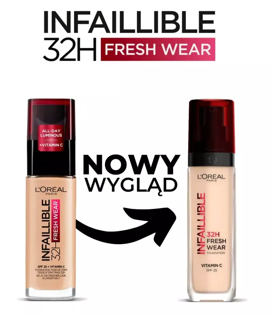 Wybierz nowy, jeszcze bardziej długotrwale kryjący podkład do twarzy z dodatkowym efektem rozświetlania. L'Oreal Paris Infaillible 32H Fresh Wear z SPF 25 pozwoli Ci cieszyć się niezawodnym makijażem aż do 32 godzin. Świeża, naturalna skóra przez cały dzień, a nawet dłużej to efekt lekkiej i oddychającej formuły podkładu, odpornej na ścieranie i zmianę koloru. Według 92,9% kobiet, podkład sprawdza się idealnie także przy noszeniu i zdejmowaniu maseczki, według 94,2% zapewnia idealną i nieskazitelną cerę, a dla 80,2% kobiet, skóra jest promienna nawet po wysiłku fizycznym. Nowy Infaillible 32H Fresh Wear ma to samo satynowe wykończenie, lecz dzięki mikro perełkom rozpraszającym światło, cera jest bardziej promienna, a dodatek witaminy CG sprawi, że z czasem staje się jeszcze bardziej rozświetlona. Testowany dermatologicznie, odpowiedni dla każdego rodzaju skóry.